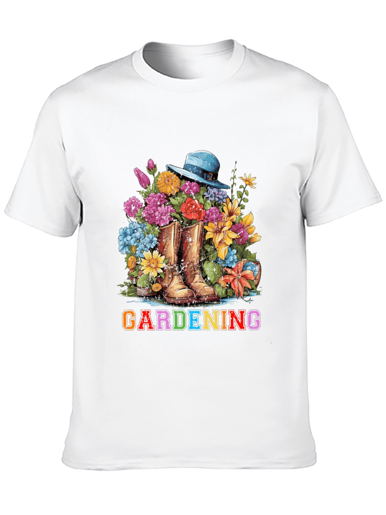 Show off your love for gardening with this stylish black t-shirt! Featuring a vibrant graphic of gardening boots overflowing with colorful flowers and topped with a blue hat, this shirt is perfect for any gardening enthusiast. The word "GARDENING" is written in a rainbow of colors below the graphic, adding a touch of whimsy. Made from comfortable materials, it's ideal for casual wear, gardening days, or simply expressing your passion for plants. A great gift for the gardener in your life!