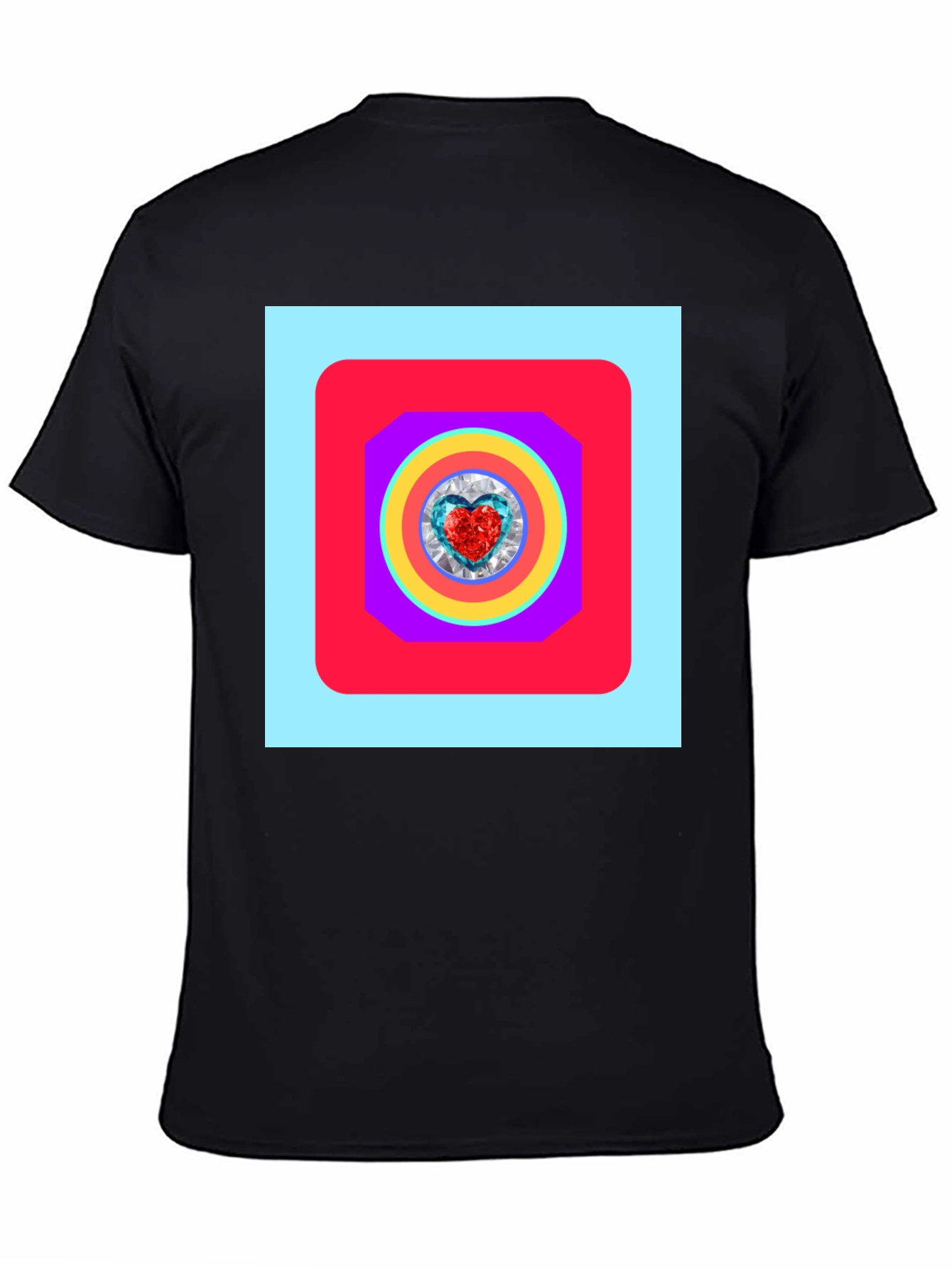 Elevate your casual style with this unique black t-shirt featuring a bold geometric heart design. The vibrant graphic showcases a concentric square pattern in shades of blue, red, purple and yellow, framing a detailed heart in the center. Made from a soft, breathable fabric, this tee offers both comfort and style. Perfect for everyday wear, concerts, or casual outings. Make a statement with this eye-catching piece that blends modern art with classic menswear. Easy to pair with jeans or shorts for a versatile, fashionable look.