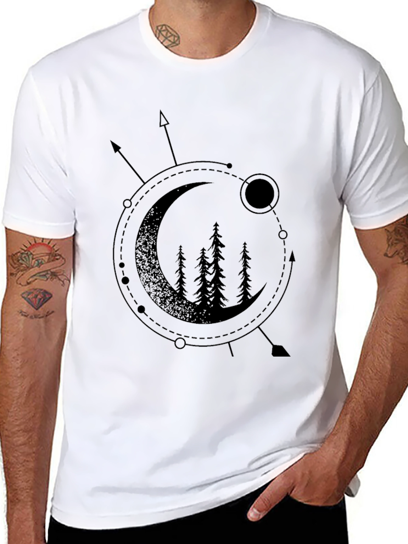 Embrace nature-inspired style with this sleek black t-shirt. The focal point is a captivating geometric design featuring a crescent moon enclosing a silhouette of pine trees. Fine dotted lines and directional arrows encircle the moon, adding a touch of minimalist flair. Crafted from a soft, comfortable fabric, this tee is perfect for everyday wear. Pair it with jeans or shorts for a casual yet stylish look. Whether you're exploring the outdoors or simply relaxing at home, this graphic tee will keep you feeling comfortable and looking sharp. Elevate your wardrobe with this unique and eye-catching design.