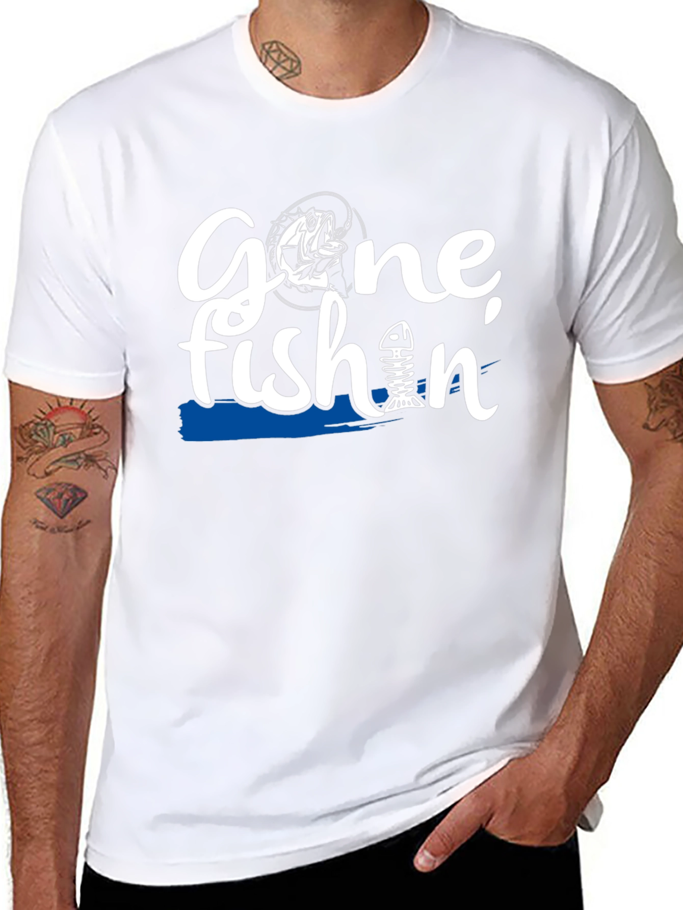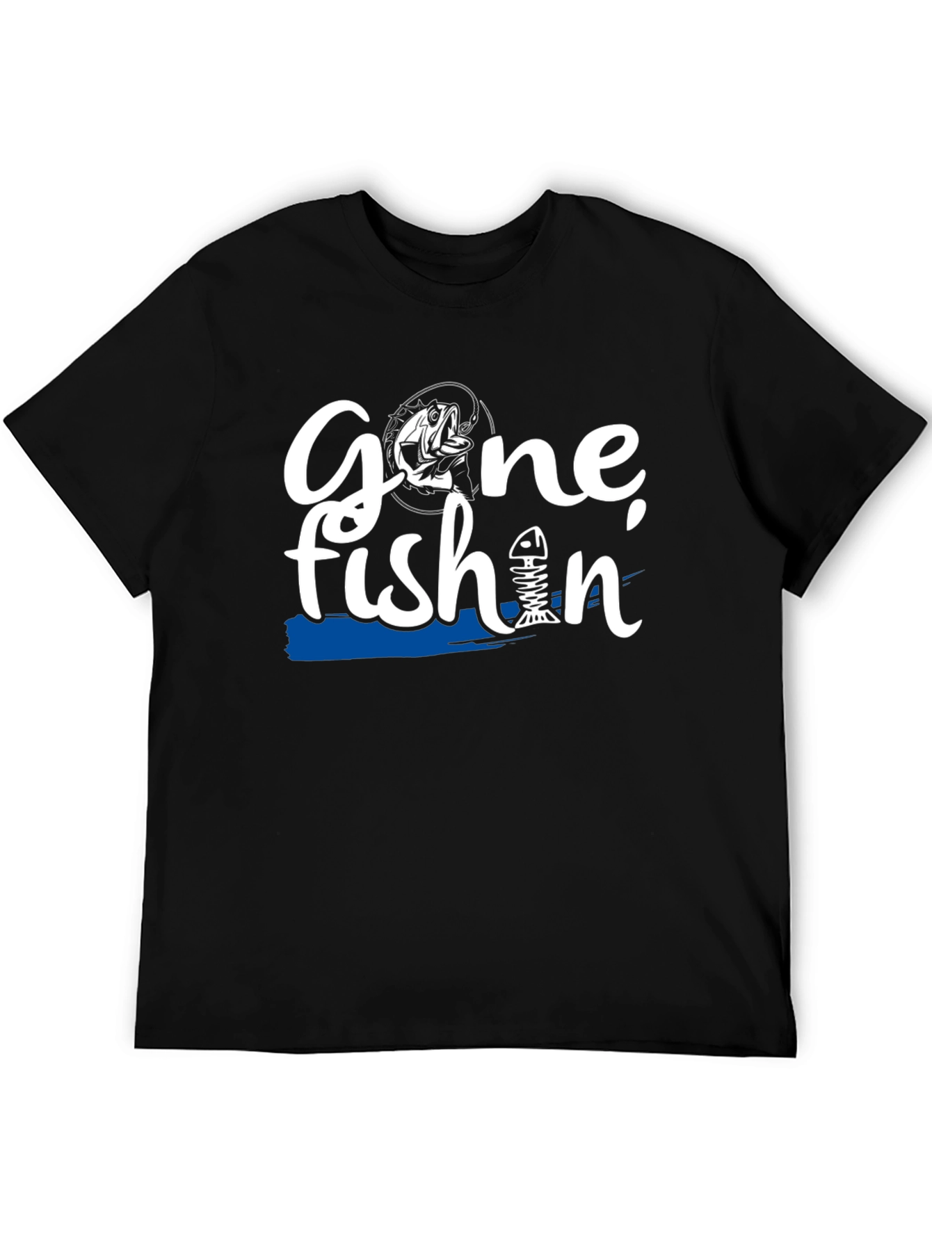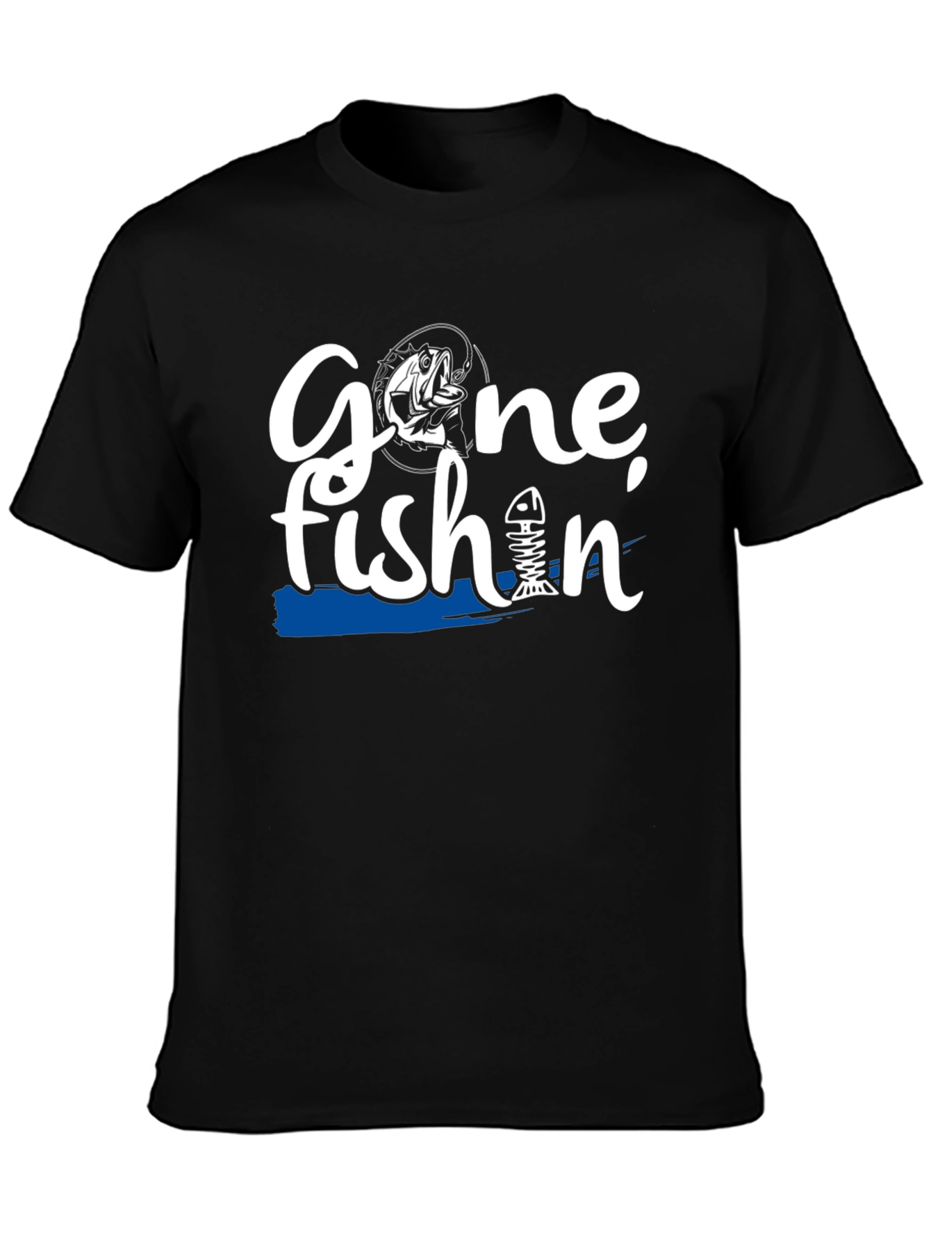 Show off your love for fishing with this stylish black t-shirt. Featuring a humorous "Gone Fishin'" graphic with a fish jumping on a line and a fish skeleton, this tee is perfect for casual wear. Made from comfortable materials, it's ideal for fishing trips, relaxing at the lake, or everyday adventures. The relaxed fit ensures all-day comfort, while the playful design adds a touch of personality to your wardrobe. This shirt is a must-have for any angler looking to express their passion in style.