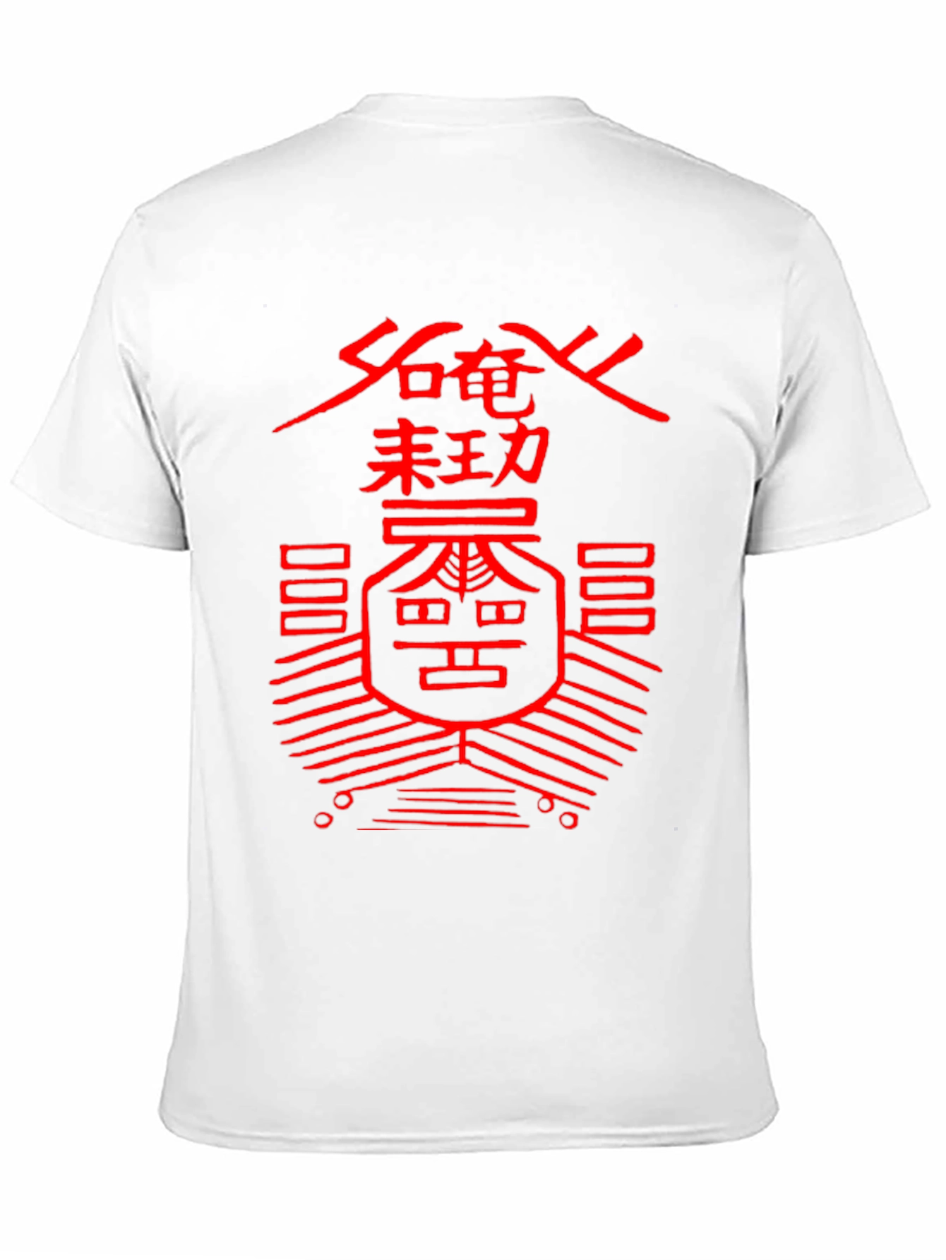 Showcase a unique style with this black t-shirt featuring a striking red graphic print. The design appears to be an Asian-inspired symbol, adding an element of mystery and cultural intrigue to your wardrobe. Made from a comfortable material, this short-sleeved shirt offers a relaxed fit, perfect for casual wear. Dress it up with dark jeans and boots or wear it casually with shorts. This t-shirt is a perfect way to make a bold statement. Great for those looking to add a unique, eye-catching piece to their wardrobe.