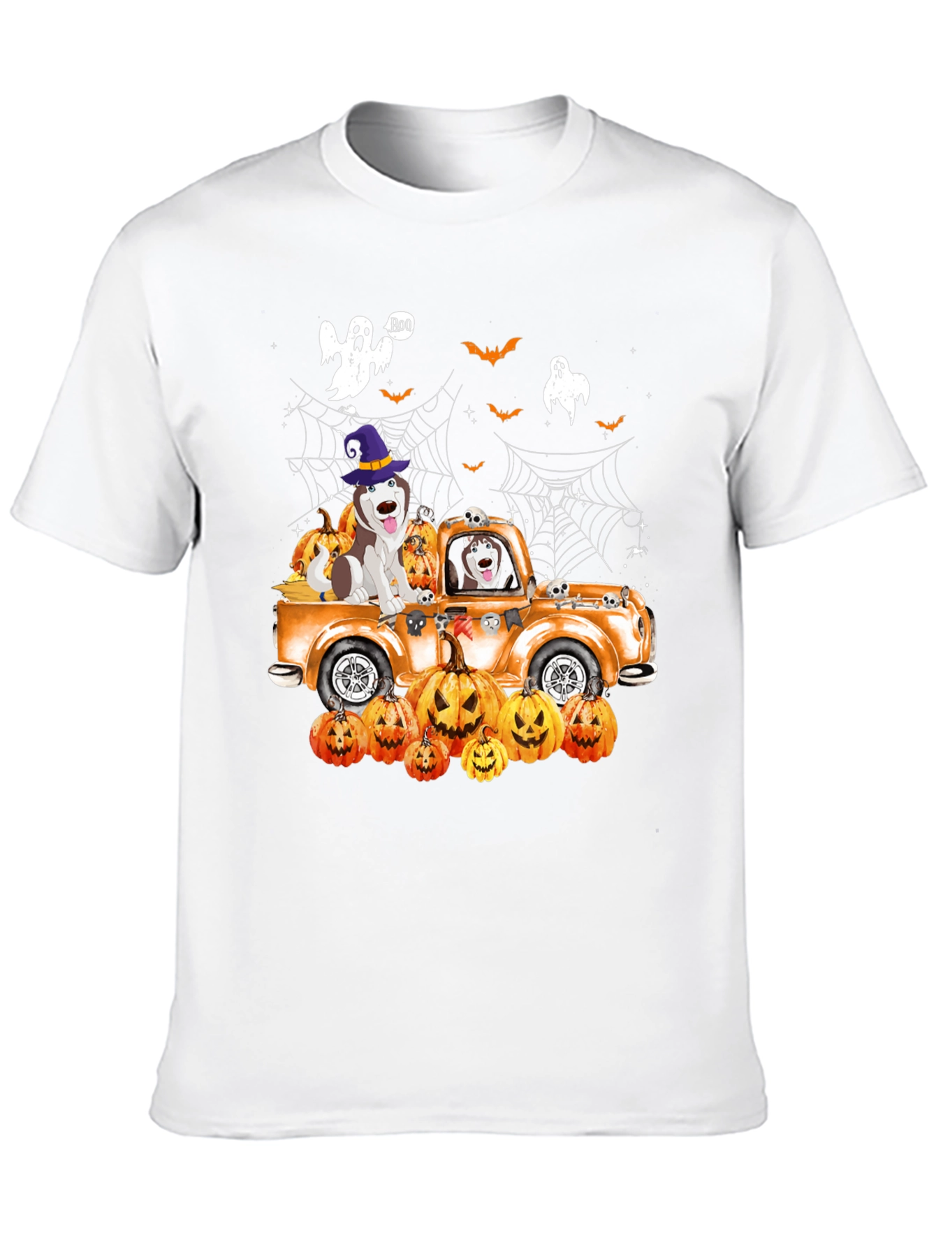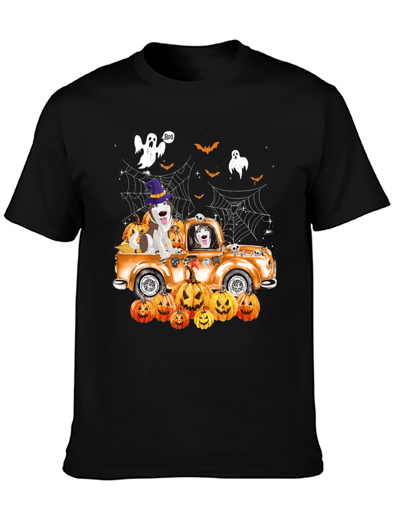 Embrace the spooky season with this unique Halloween-themed T-shirt! This eye-catching black tee features a vibrant design showcasing an orange vintage truck filled with adorable huskies, pumpkins, bats, spiders, and ghostly apparitions. One of the huskies is wearing a witch's hat. The detailed graphic is perfect for Halloween parties, trick-or-treating, or adding a festive touch to your everyday wardrobe. The soft, breathable fabric ensures a comfortable fit, making it ideal for all-day wear. Get ready to celebrate Halloween in style with this playful and spirited shirt!