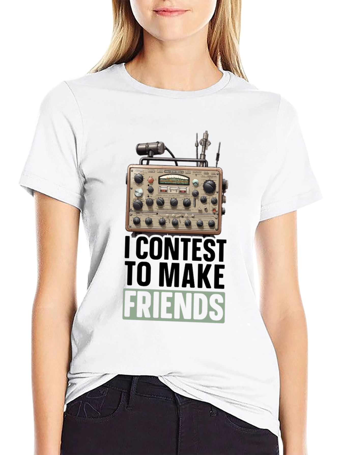 Showcase your love for amateur radio with this unique black t-shirt. Featuring a vintage-style ham radio graphic, this shirt is perfect for enthusiasts and operators alike. The design also includes the phrase "I Contest to Make Friends," highlighting the friendly and competitive spirit of the hobby. Made from a soft, comfortable fabric, this tee is ideal for everyday wear or your next ham radio event. A must-have addition to any ham radio operator's wardrobe! Get yours today and let the world know about your passion.