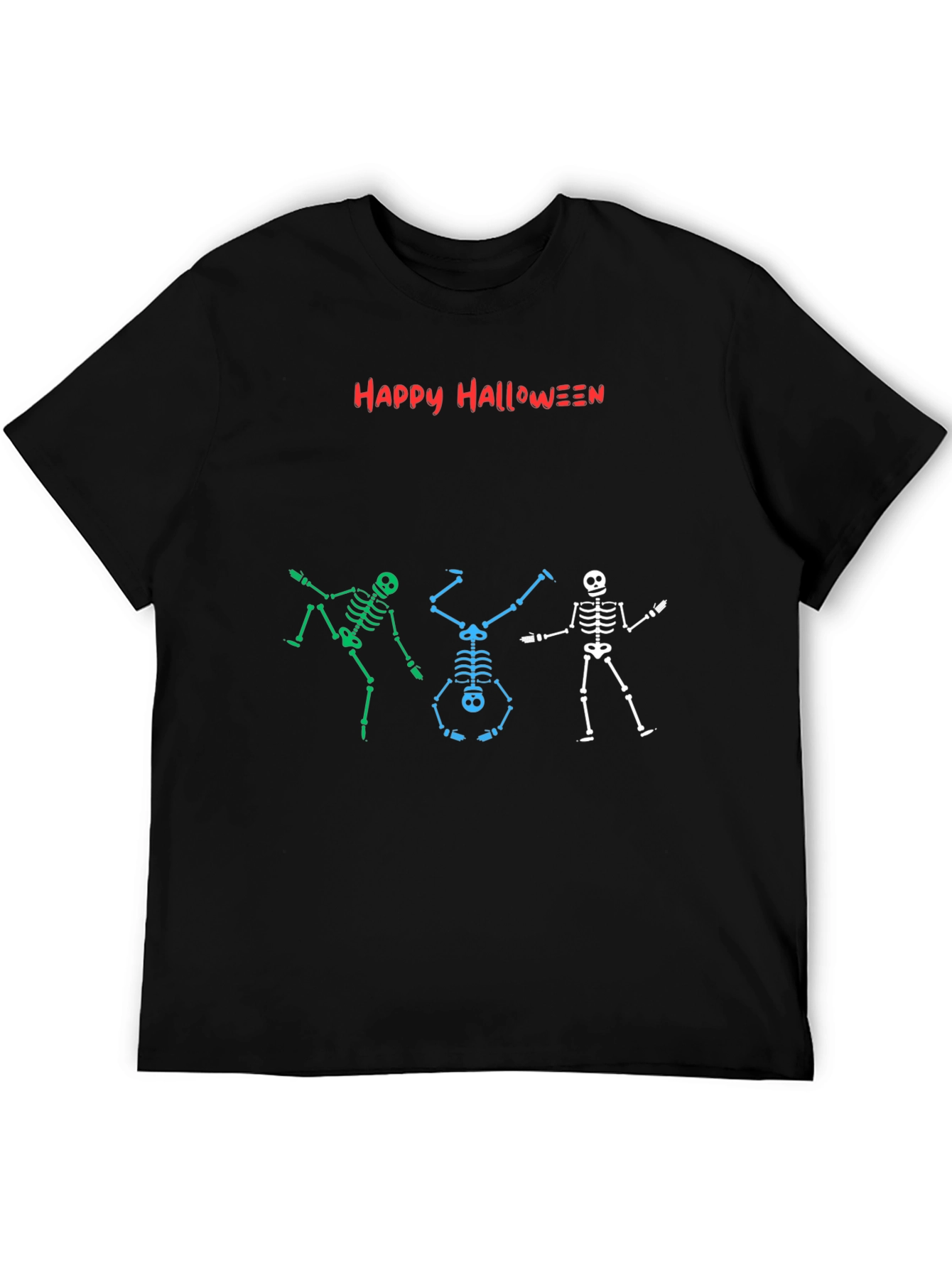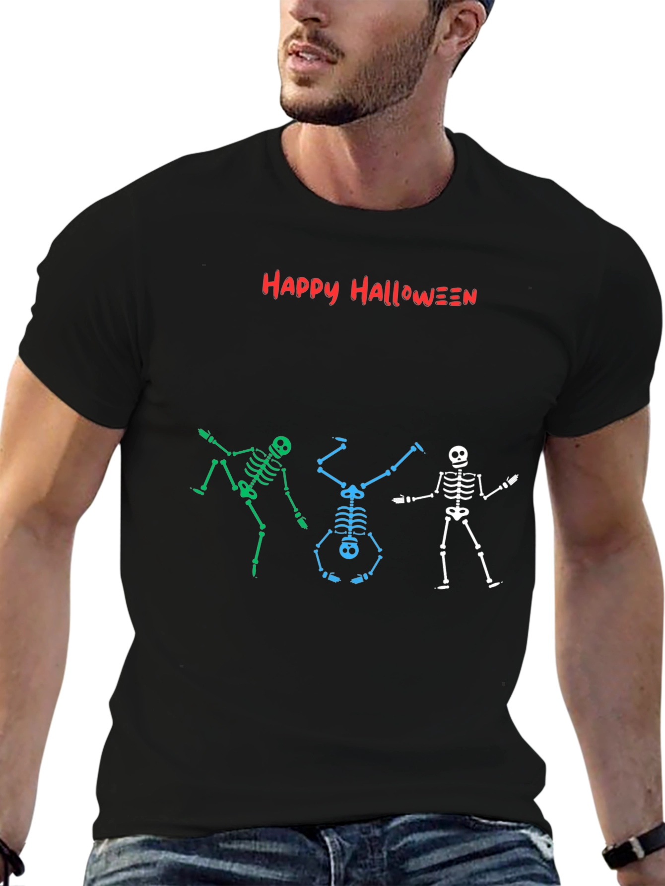 Get ready to groove into the spooky season with this eye-catching Halloween t-shirt! Featuring three colorful skeleton dancers in green, blue, and white, this tee is perfect for adding a playful and festive touch to your wardrobe. Above the skeletons is "Happy Halloween" in red text. Made from a comfortable, soft fabric, this classic black tee is designed for all-day wear, whether you're trick-or-treating, attending a Halloween party, or simply showing off your holiday spirit. Stand out from the crowd and let the skeleton dance begin!