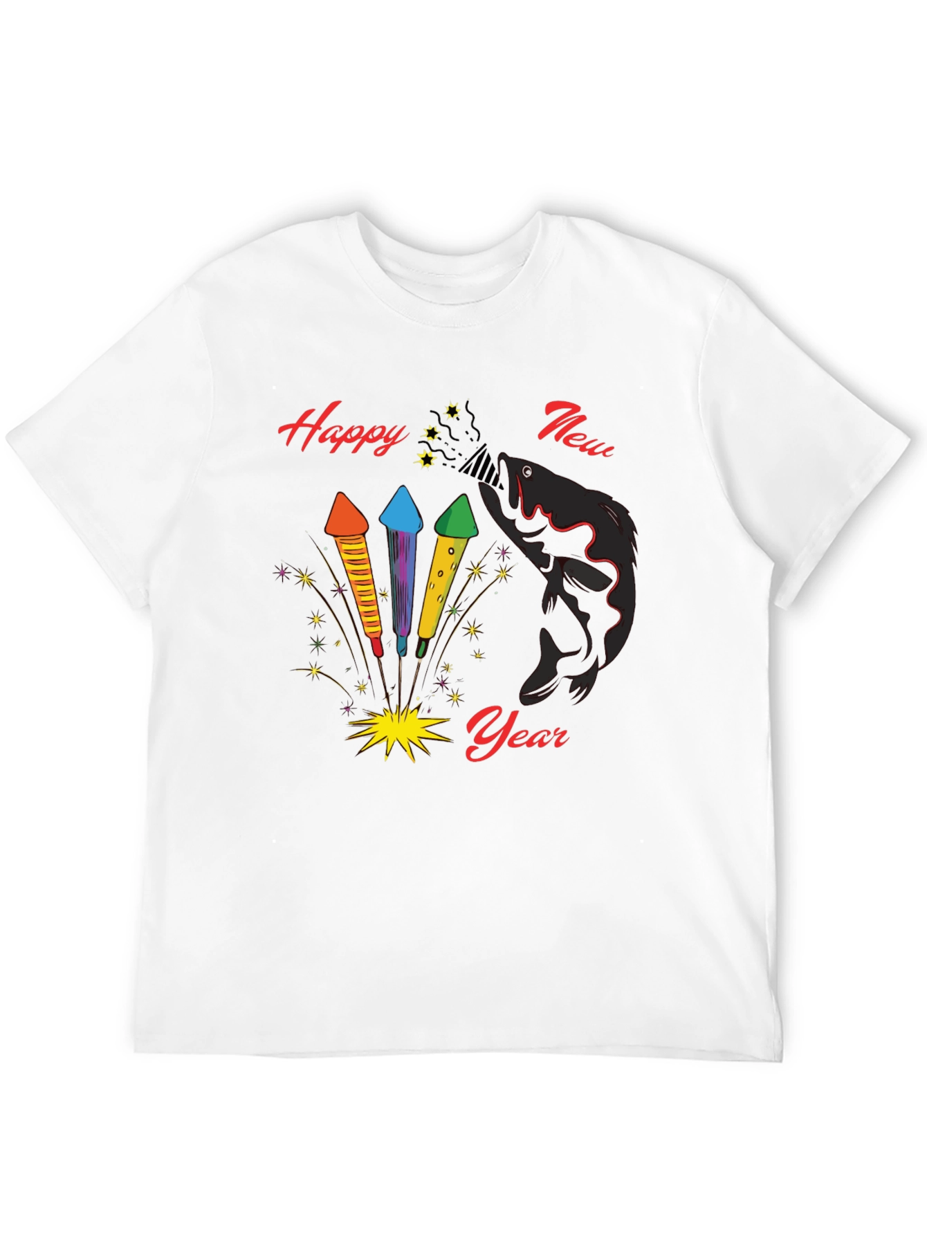 Celebrate the New Year with this unique black graphic tee! The shirt features a playful design with colorful fireworks and a black fish 'lighting' the fuse. The words "Happy New Year" are printed in a festive red script. Made from a comfortable, breathable fabric, this t-shirt is perfect for casual wear during New Year's celebrations or any time you want to add a touch of fun to your outfit. Show off your quirky style and ring in the New Year with this eye-catching tee!
