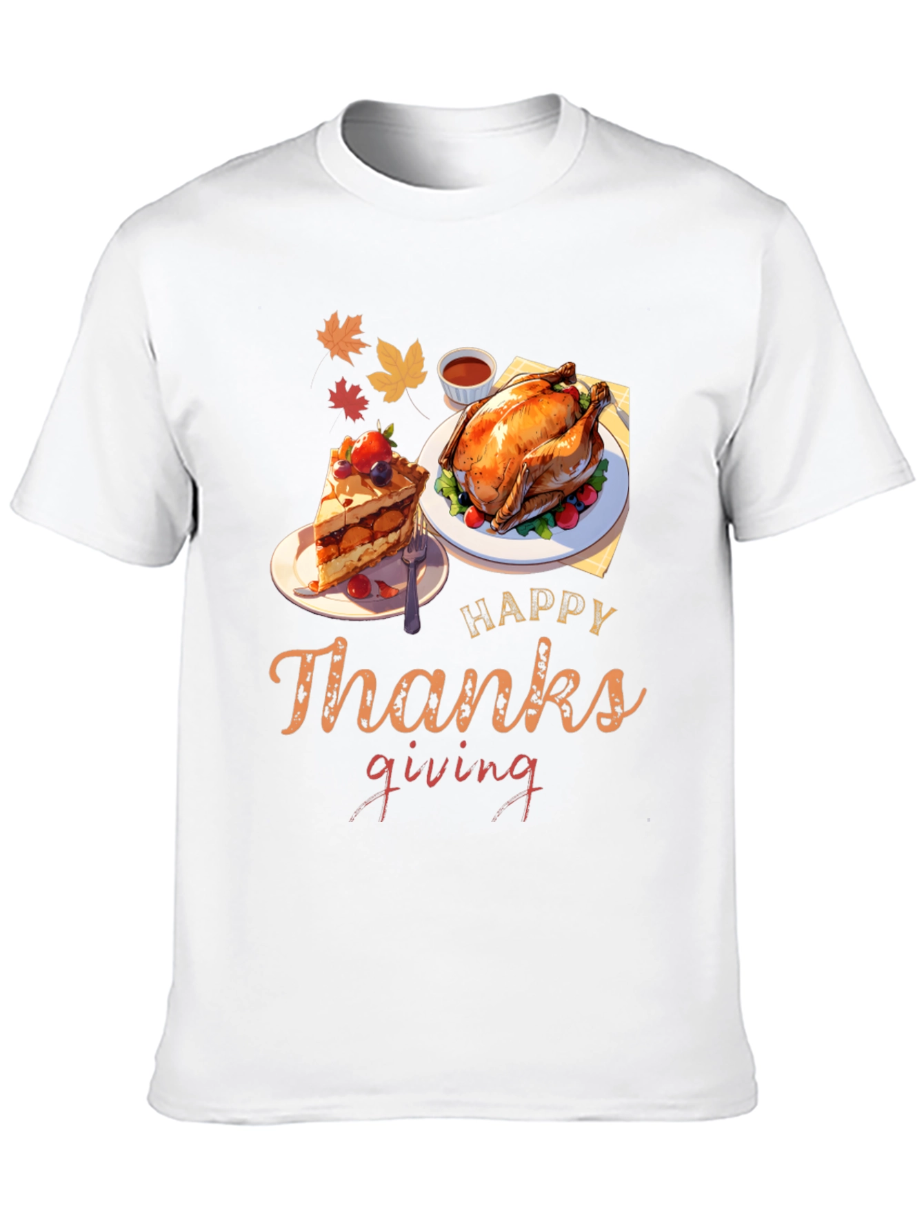 Celebrate Thanksgiving in style with this festive graphic tee! The shirt features a delicious-looking Thanksgiving feast design. A slice of pie, a fully cooked turkey, and fall leaves make this design pop. The words "Happy Thanksgiving" are artistically displayed. Made from comfortable fabric, this tee is perfect for holiday gatherings, family dinners, or just showing your Thanksgiving spirit. Wear it to the Thanksgiving Day parade or while cooking up a storm in the kitchen. Makes a great gift for friends and family who love the holiday season.