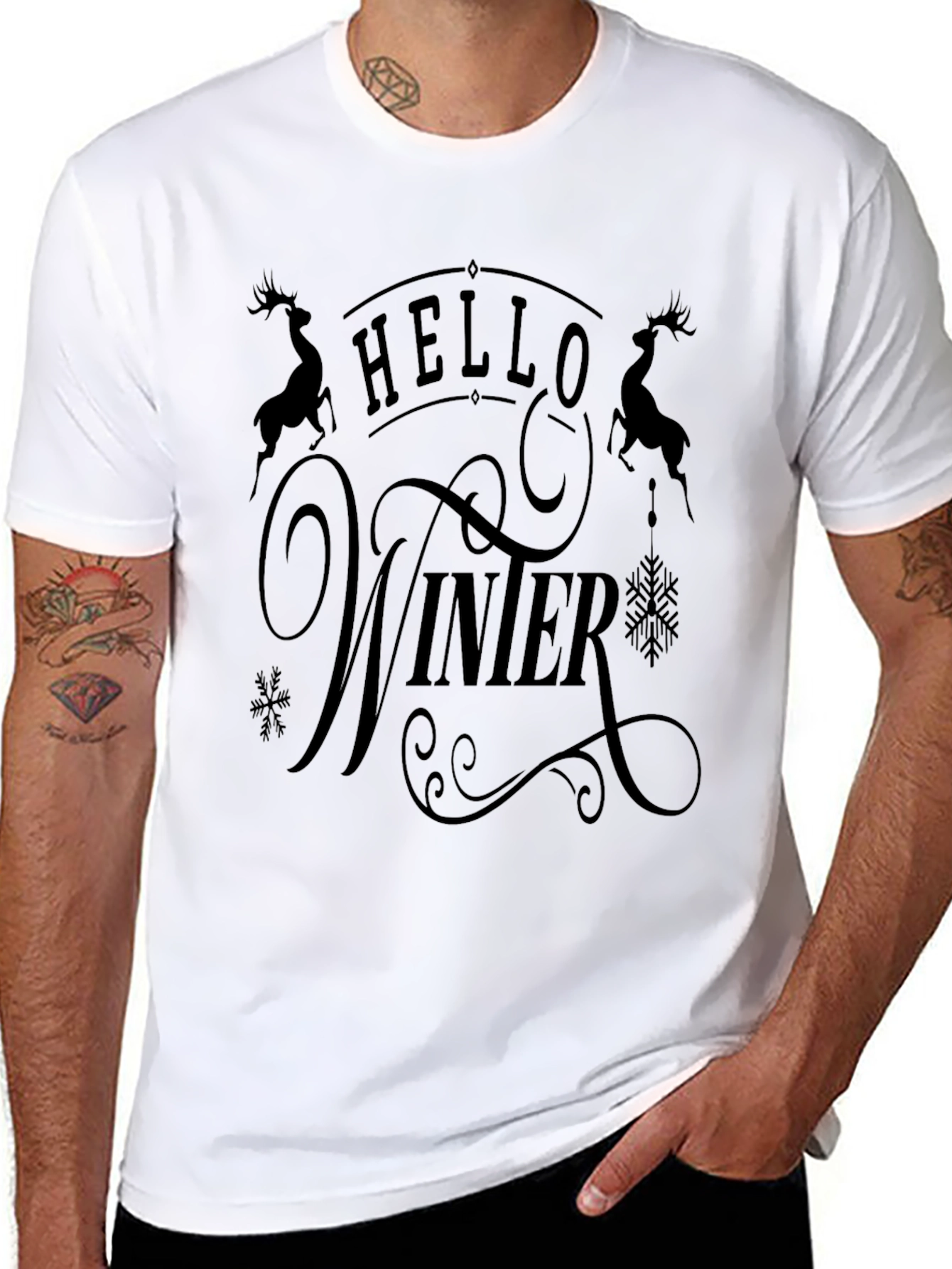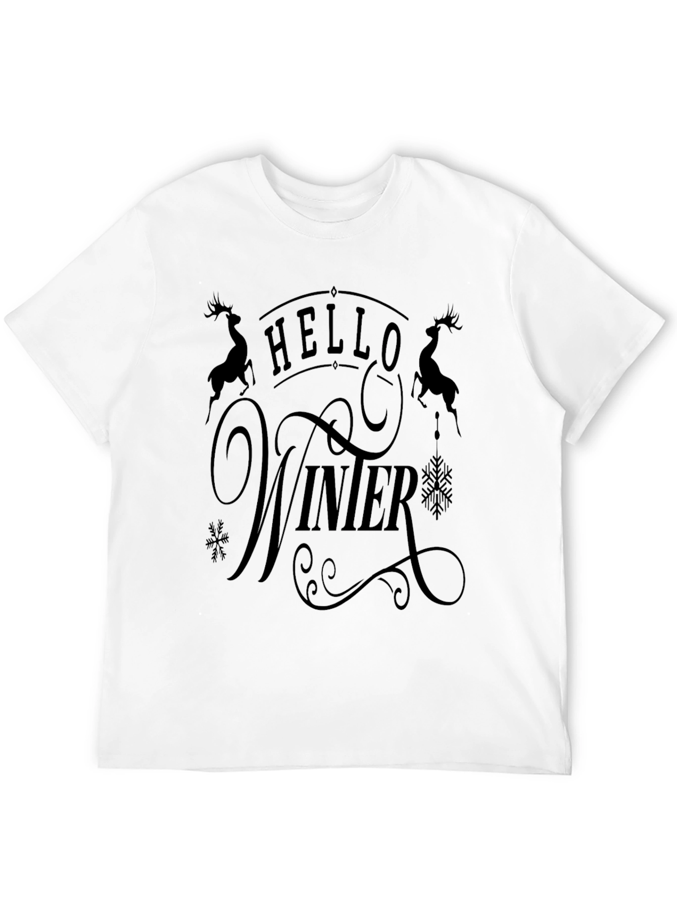 Embrace the winter season with this stylish black graphic t-shirt. The shirt features a unique "Hello Winter" design, complete with decorative flourishes, reindeer silhouettes, and snowflakes, making it perfect for holiday gatherings or casual winter wear. The print is subtly integrated into the dark fabric, offering a sleek and understated look. Made from a comfortable, breathable fabric, this tee is ideal for layering under jackets or wearing on its own during milder days. Its classic fit ensures a flattering look for all body types. This shirt is a great way to show your love for the winter season in a fashionable and comfortable way. Perfect for casual outings, holiday parties, or simply relaxing at home.