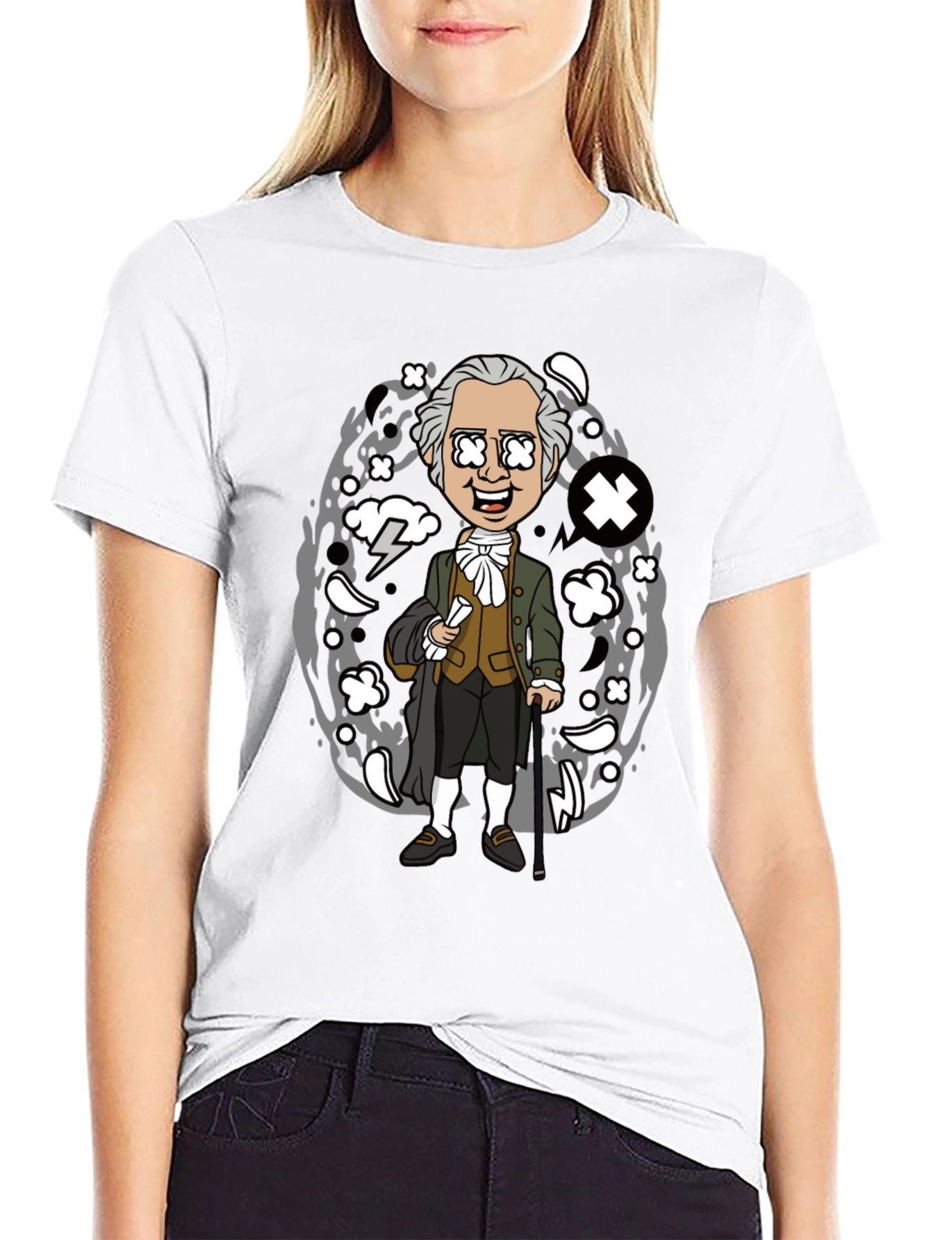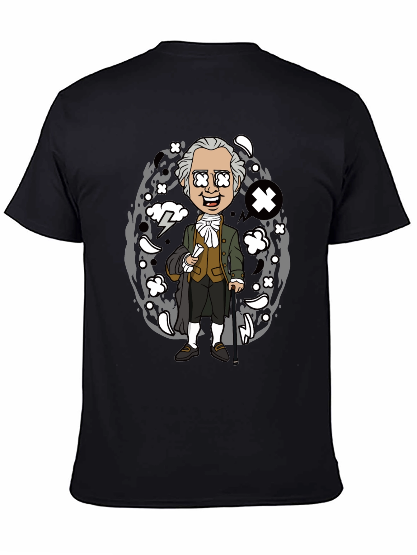 This black t-shirt features a unique cartoon graphic of a historical figure. The design showcases the figure with 'X' eyes, holding a document and cane, surrounded by stylized clouds. Made from a soft, breathable fabric, it offers comfort and durability for everyday wear. The bold graphic makes a statement, perfect for history buffs and cartoon enthusiasts alike. Pair it with jeans or shorts for a casual, yet stylish look. The t-shirt is easy to care for and will maintain its shape and color after multiple washes.