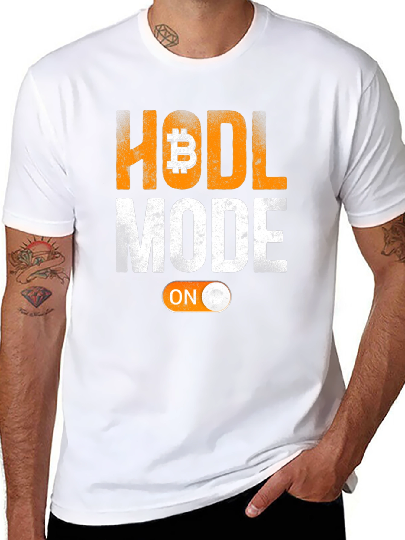 Show off your crypto commitment with this "HODL Mode On" t-shirt. Featuring a bold design with "HODL" emblazoned on the front in a distressed orange font, with the Bitcoin symbol in place of the "B", followed by "MODE" in white and a toggle switch set to "ON", this tee is a statement piece. Crafted from a comfortable black fabric, it's perfect for crypto enthusiasts, investors, or anyone passionate about blockchain technology. Ideal for casual wear, meetups, or making a statement at crypto events.