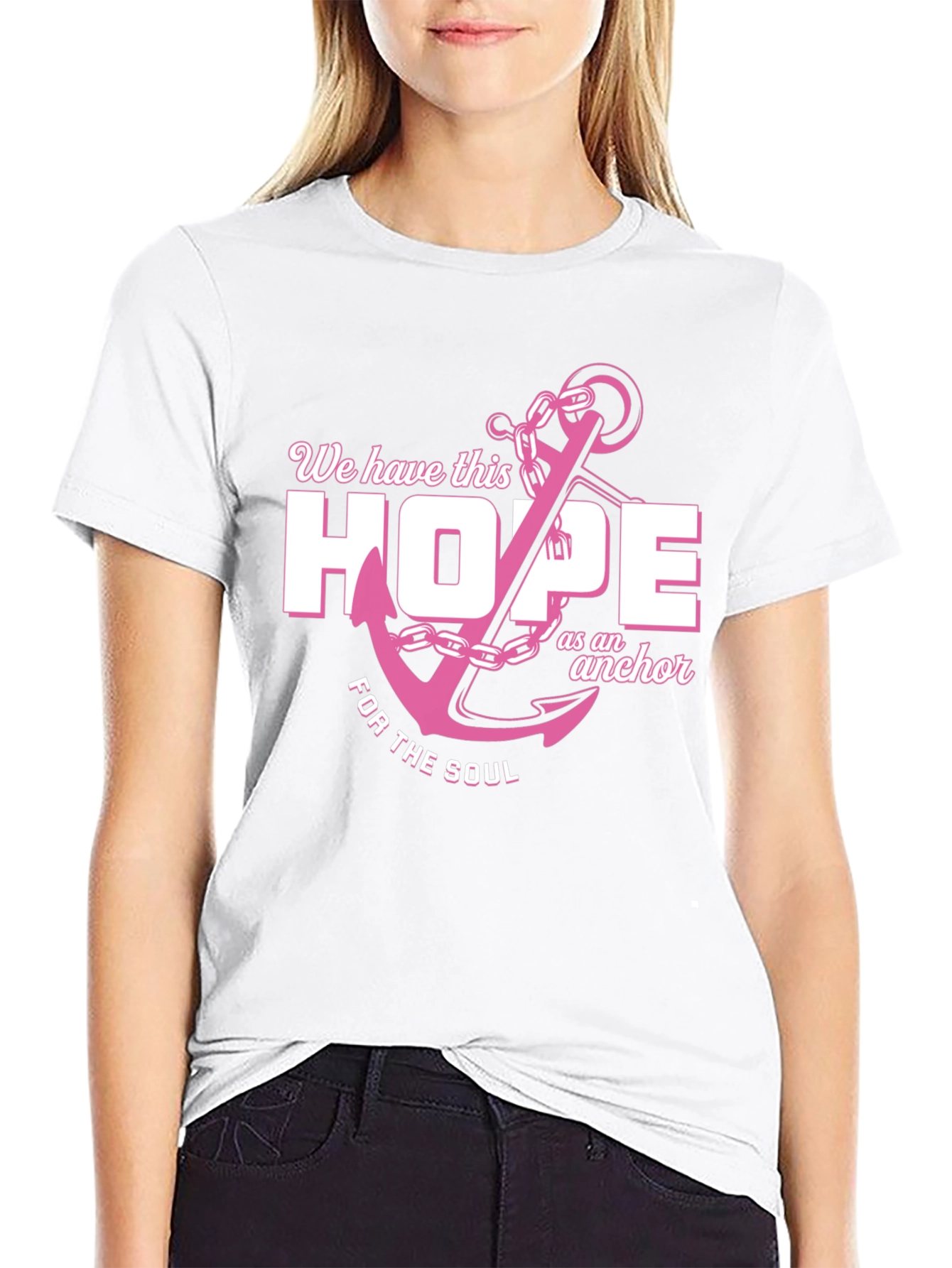 Show your faith with this graphic tee! This black t-shirt features a pink anchor design with the phrase 'We have this HOPE as an anchor FOR THE SOUL'. The design is printed on a soft, breathable fabric, ensuring comfort all day long. The shirt is a standard fit, making it a versatile addition to any wardrobe. Ideal for casual wear, church events, or as a thoughtful gift for someone special. Express your beliefs with this stylish and meaningful t-shirt.