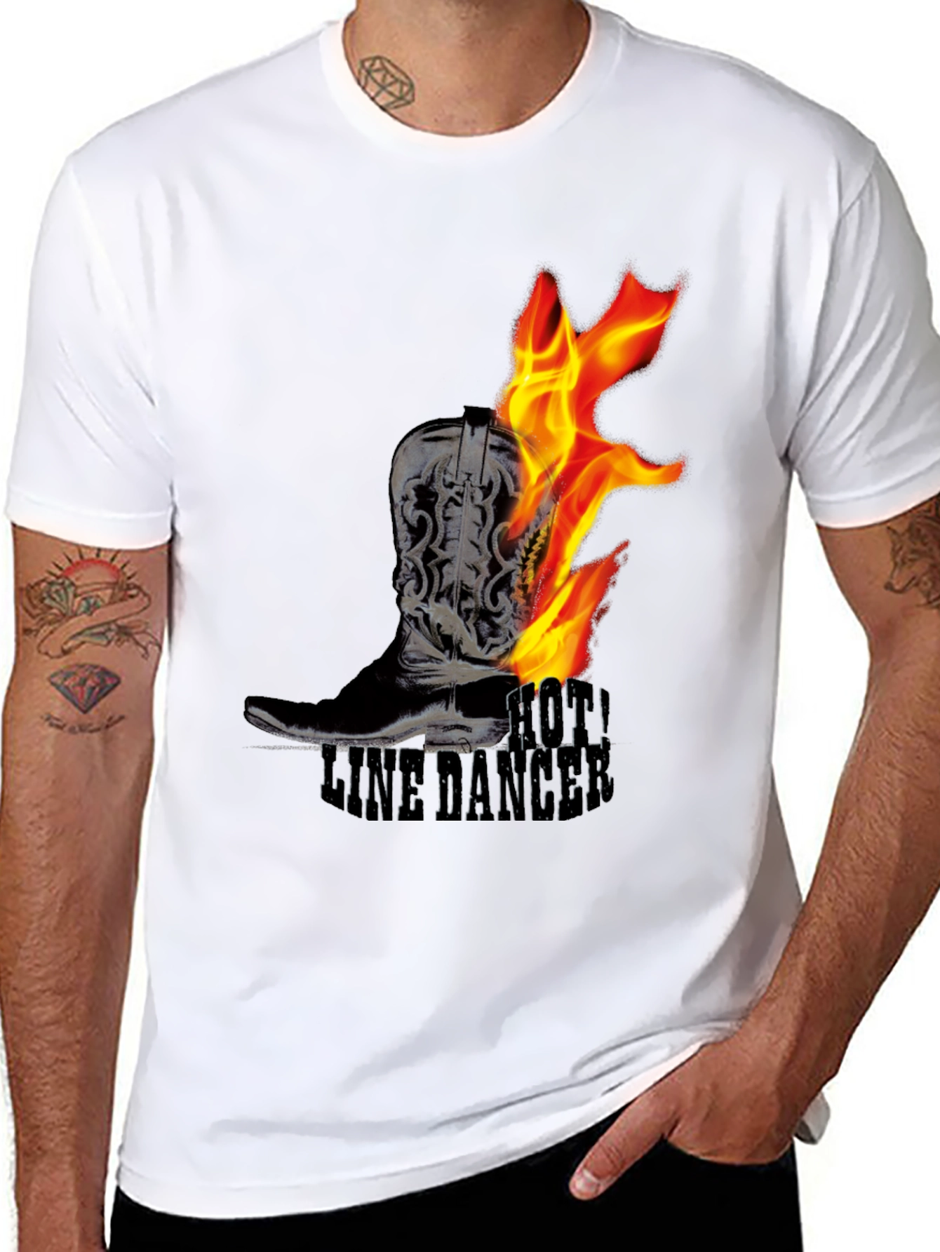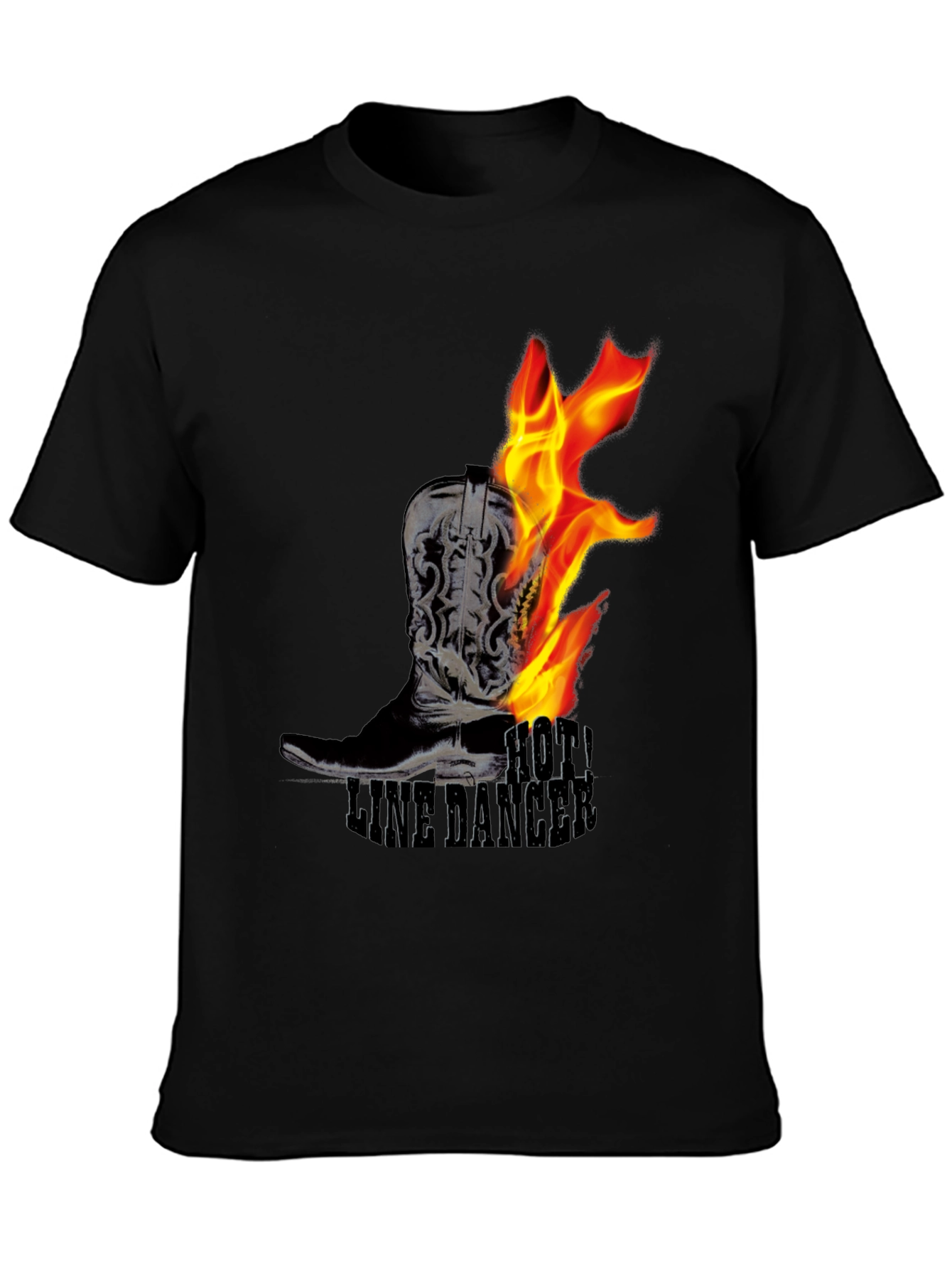 Ignite your style with this bold graphic tee. This black t-shirt features a striking design of a cowboy boot engulfed in flames, accompanied by the words "Hot Line Dancer". The eye-catching graphic makes a statement. Crafted from comfortable fabric, this tee offers a classic fit, perfect for casual wear or adding an edgy touch to your outfit. Ideal for dancers, country music enthusiasts, or anyone who loves unique apparel. Stand out from the crowd with this fiery fashion piece!