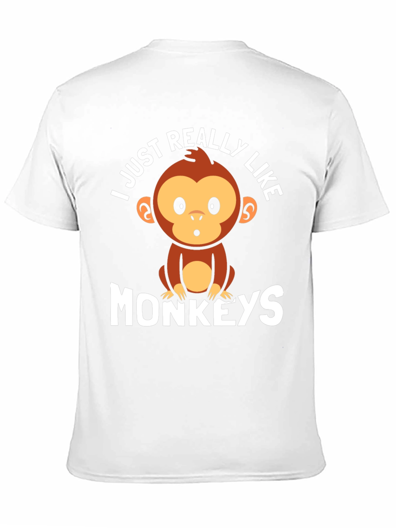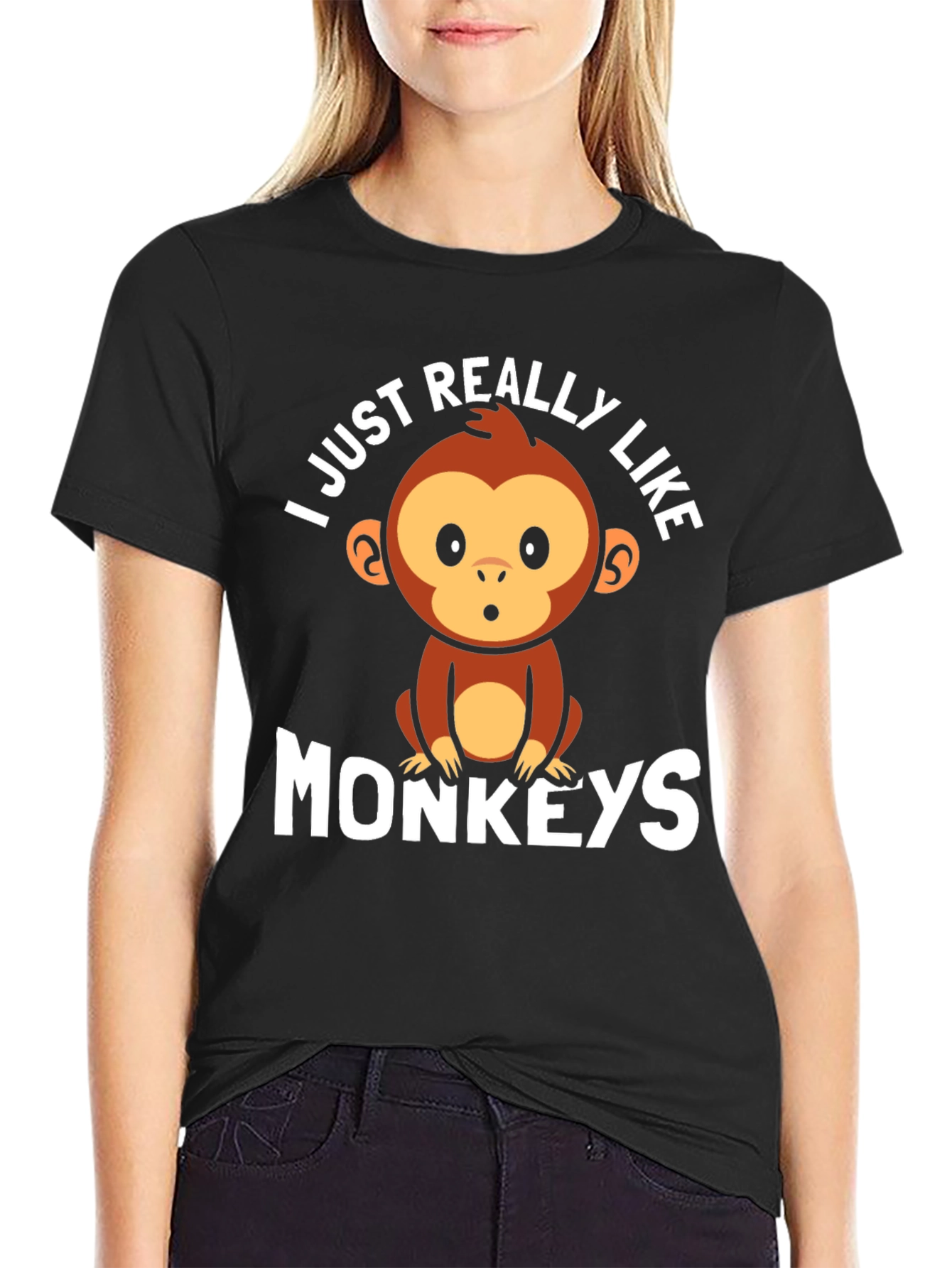 Show off your love for monkeys with this adorable graphic tee! Featuring a cute cartoon monkey, the design reads 'I JUST REALLY LIKE MONKEYS' in bold, eye-catching text. The shirt appears to be made of soft, comfortable black fabric, perfect for casual wear. This fun t-shirt is great for everyday wear or as a gift for the monkey enthusiast in your life. Pair it with jeans, shorts, or leggings for a playful and comfortable outfit. Get yours today and let everyone know about your passion for monkeys!