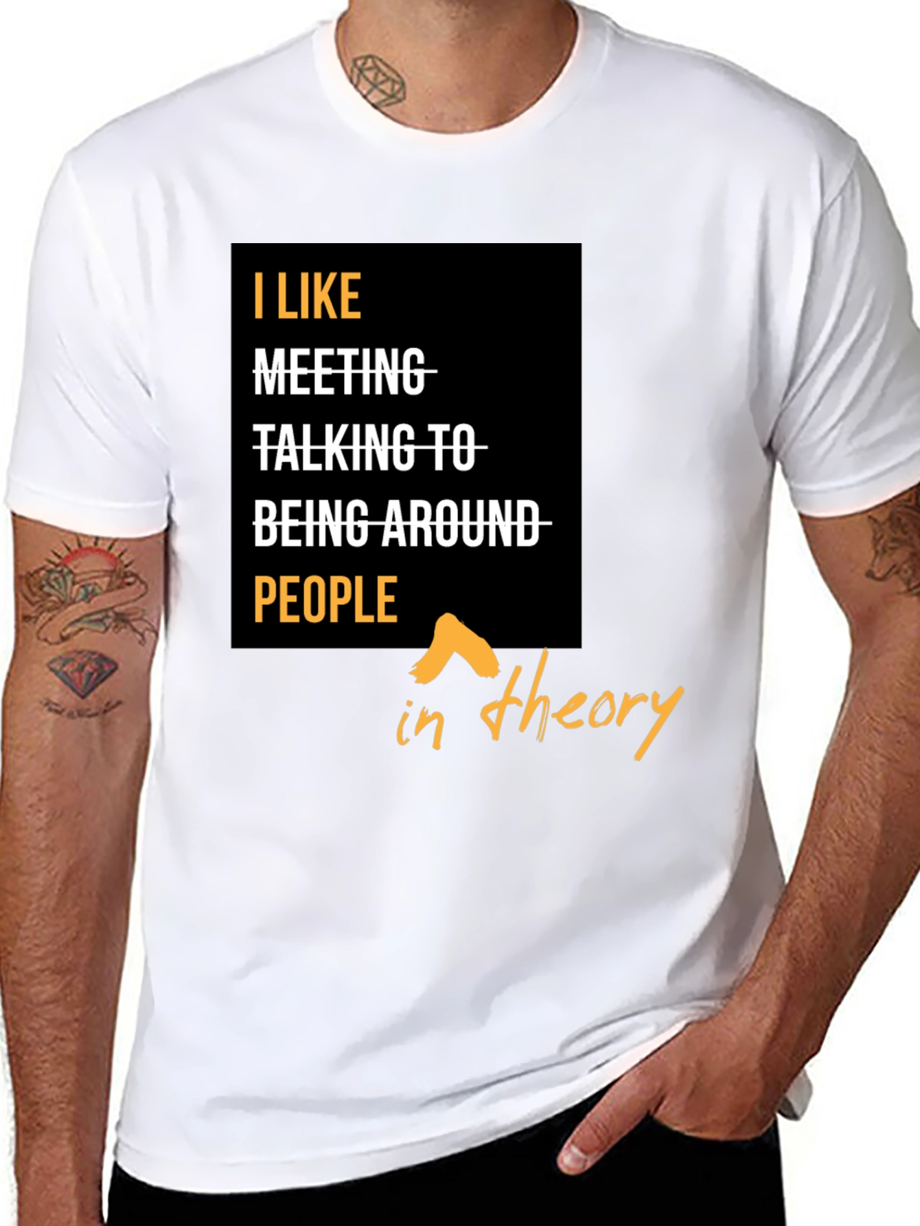 This humorous black t-shirt features a clever graphic design, perfect for introverts with a witty sense of humor. The shirt displays the phrase "I LIKE" in bold yellow letters, followed by "MEETING", "TALKING TO", and "BEING AROUND" with each word crossed out in white. Below, "PEOPLE" is presented in white, with "in theory" written in playful yellow font beneath it. Made from a comfortable, breathable fabric, this tee is ideal for casual wear, social gatherings, or as a conversation starter. Show off your unique style with this funny and relatable t-shirt!
