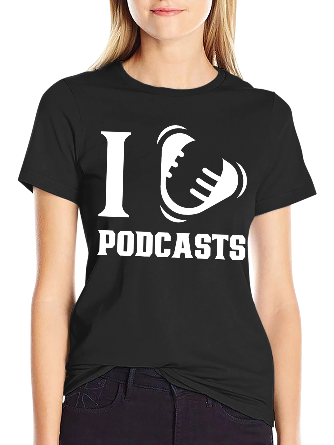 Show your passion for podcasts with this stylish black t-shirt. The shirt features a bold, white graphic that reads "I (Podcast Icon) Podcasts." Made from comfortable, breathable fabric, this tee is perfect for casual wear, podcast listening sessions, or as a conversation starter. Whether you're a dedicated listener or a podcast creator, this shirt is a fun way to express your love for the medium. This eye-catching design is sure to make a statement. Add this to your wardrobe or gift it to the podcast enthusiast in your life!