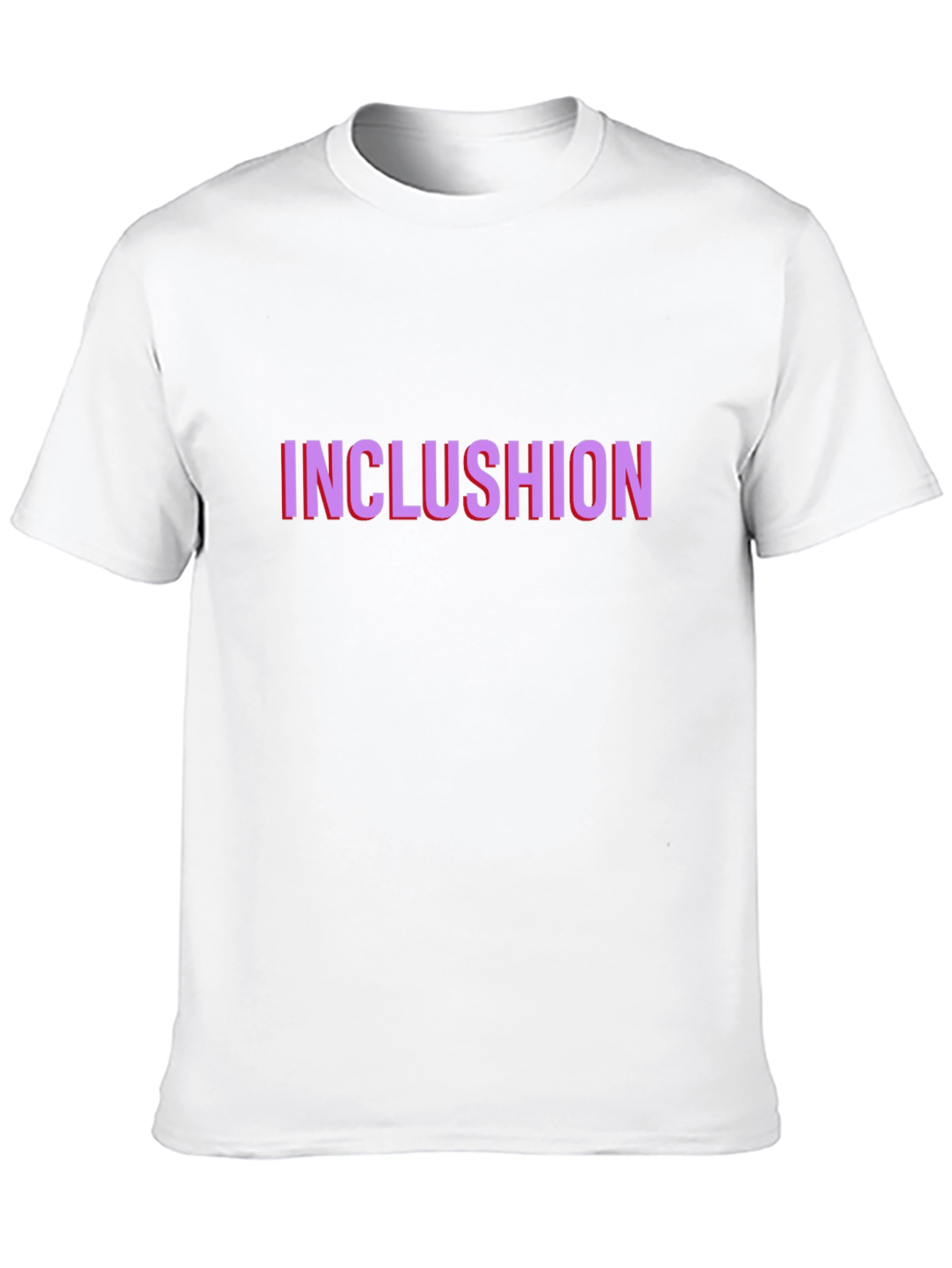 Show your support for inclusion with this bold, statement-making tee. The shirt features the word "INCLUSION" in a striking pink and purple gradient, creating a visually appealing design. Made from a comfortable black cotton blend, this t-shirt offers a soft feel and breathable fit. It's perfect for everyday wear, rallies, events, or simply spreading a positive message. The classic crew neck and short sleeves ensure a versatile and timeless style. Let your clothing reflect your values with this impactful and stylish inclusion tee. It's a great way to start conversations and promote a more inclusive world.