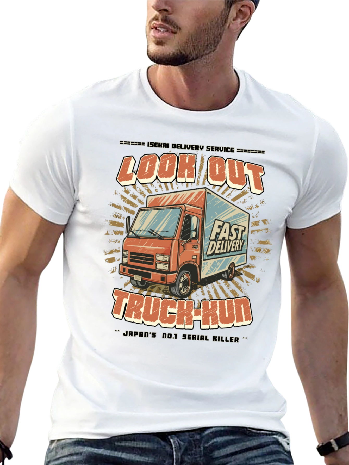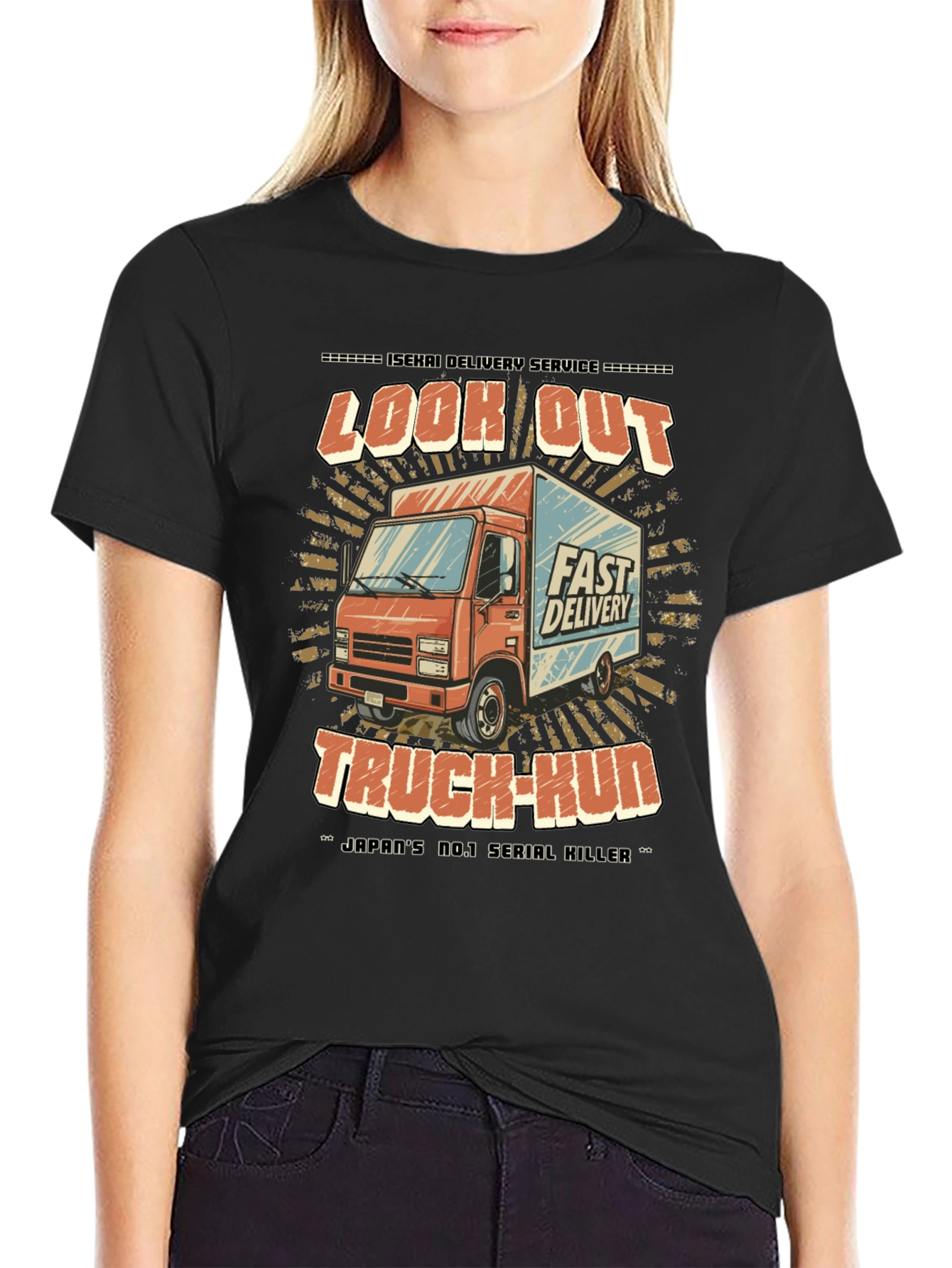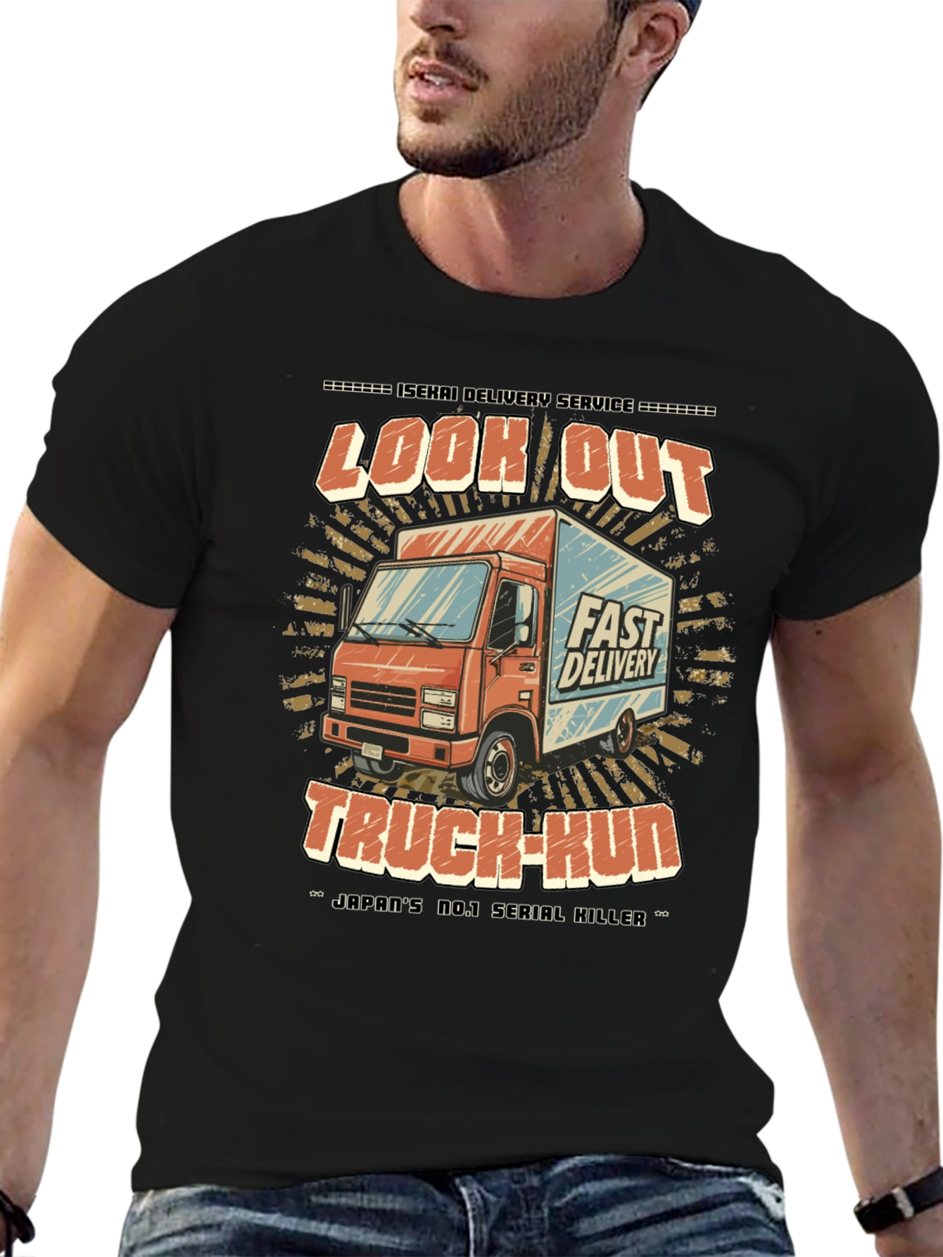 This striking black t-shirt features a bold and humorous design centered around the theme of isekai anime and delivery services. The graphic showcases a vibrant, stylized delivery truck with the words "FAST DELIVERY" emblazoned on its side. Above the truck, the text "LOOK OUT" is prominently displayed, followed by "TRUCK-KUN" underneath, humorously dubbed "Japan's No.1 Serial Killer". The design is set against a backdrop of distressed, radial lines, giving it a vintage yet edgy feel. Made from a comfortable-looking fabric, this tee is perfect for fans of anime, Japanese culture, and anyone with a sense of humor. Wear it casually or to anime conventions to spark conversation and showcase your unique style.
