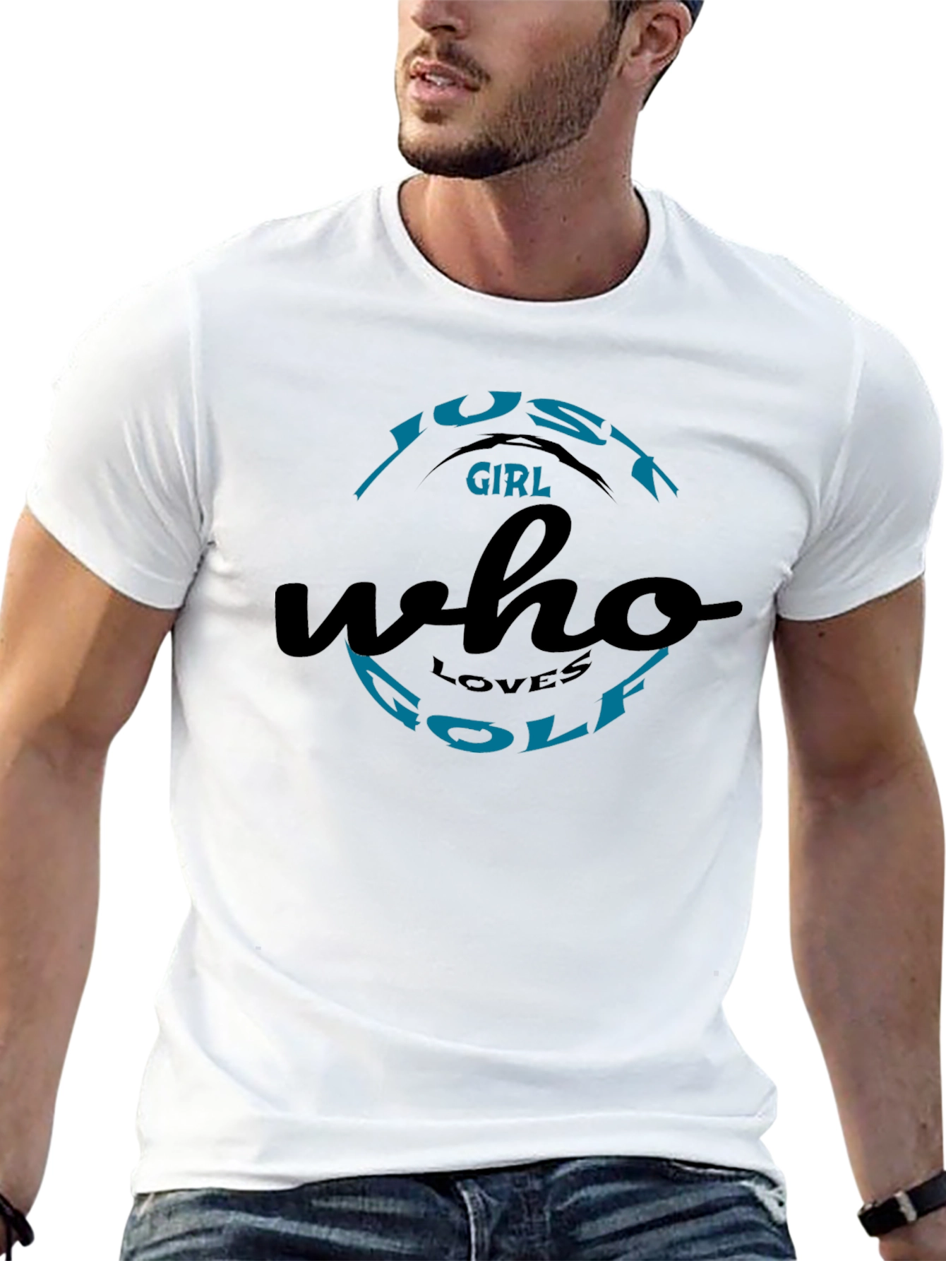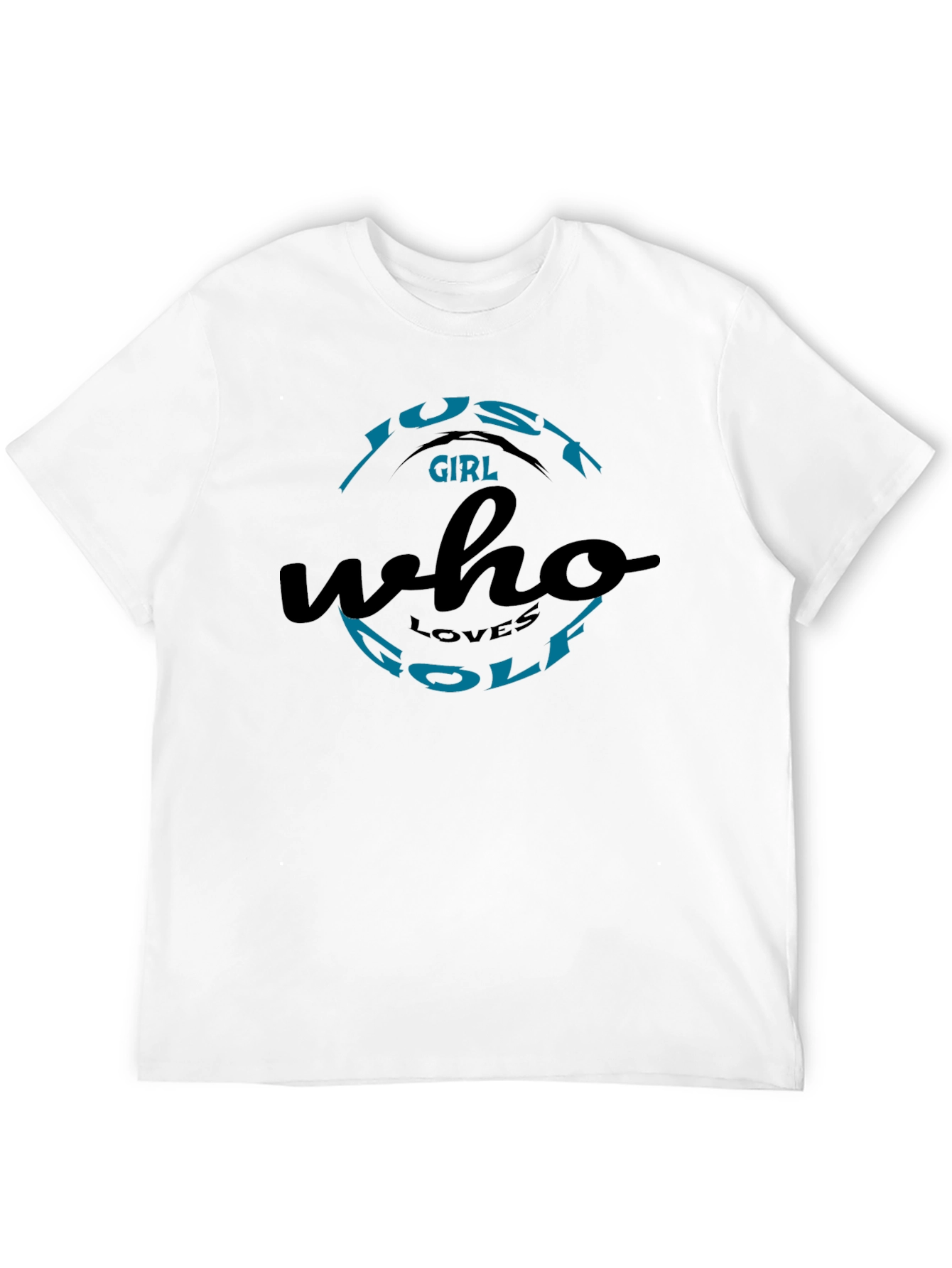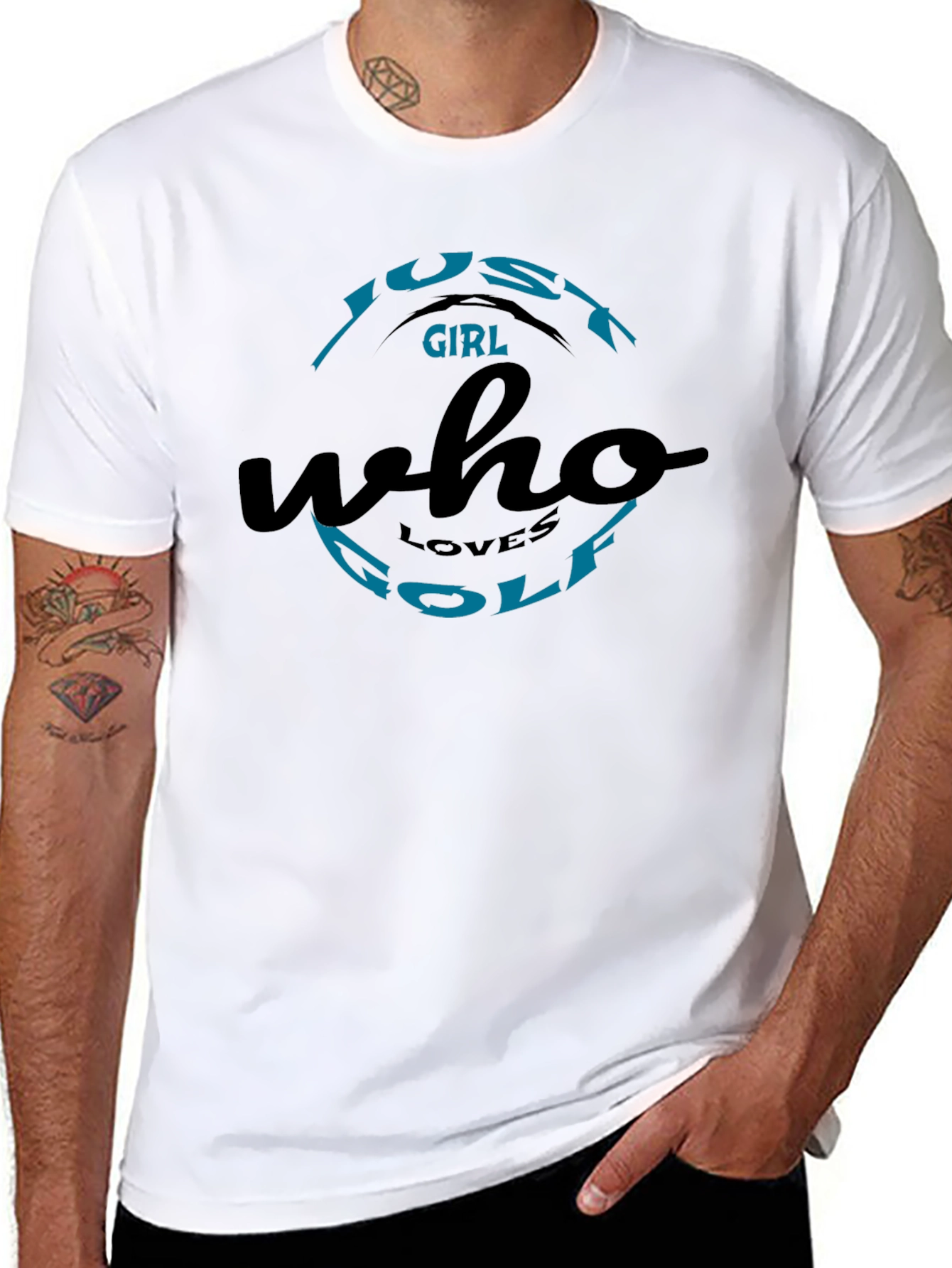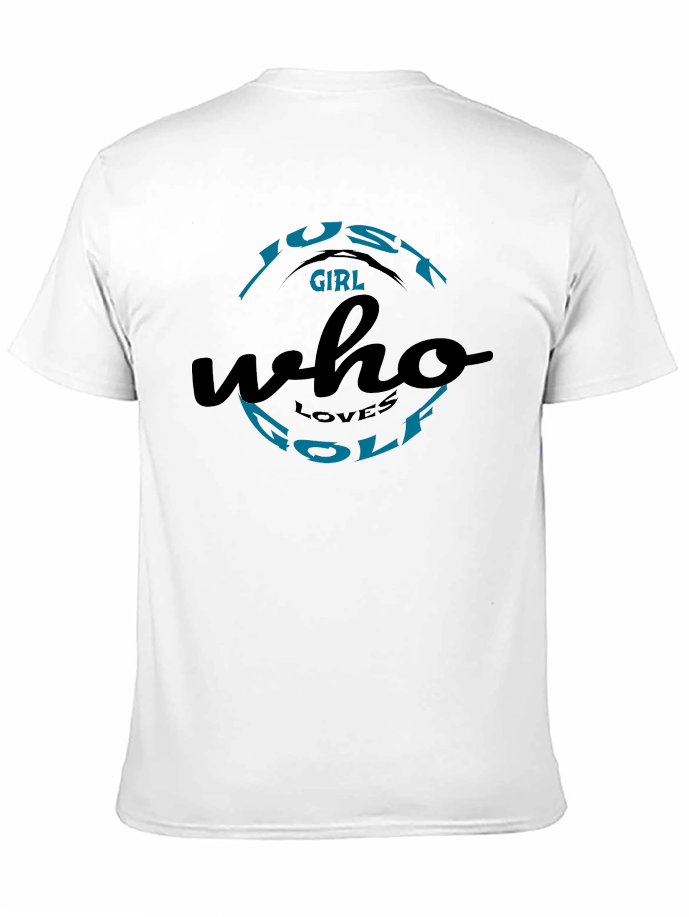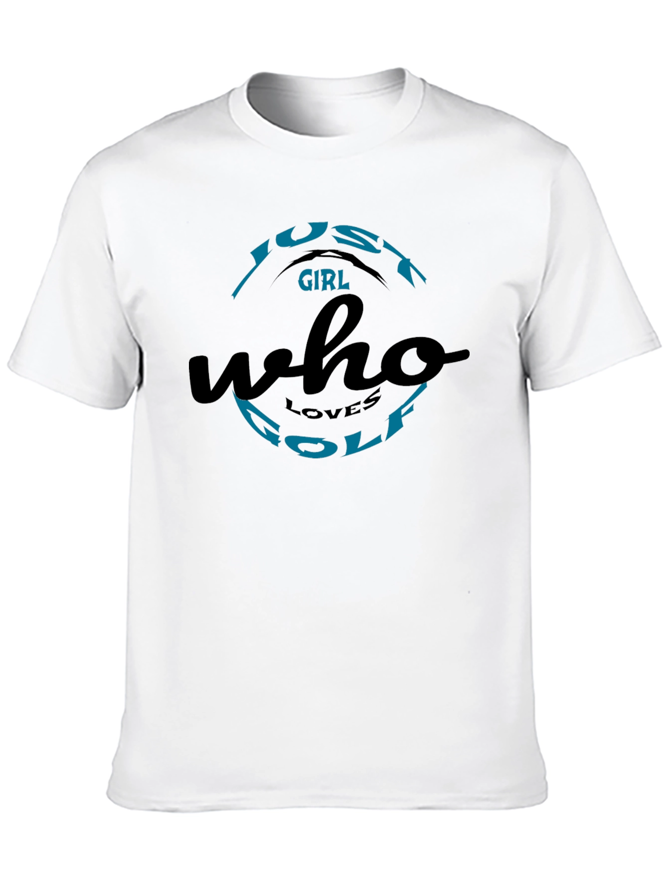 Show off your passion for golf with this stylish black t-shirt! The design features the phrase "Just A Girl Who Loves Golf" in a combination of bold black script and bright blue lettering arranged in a unique circular pattern. Made from a soft, comfortable fabric, this tee is perfect for casual wear whether you're hitting the links or relaxing off the course. Its classic fit makes it a versatile addition to any wardrobe, while the eye-catching design is sure to spark conversations. Perfect gift for golf enthusiasts!