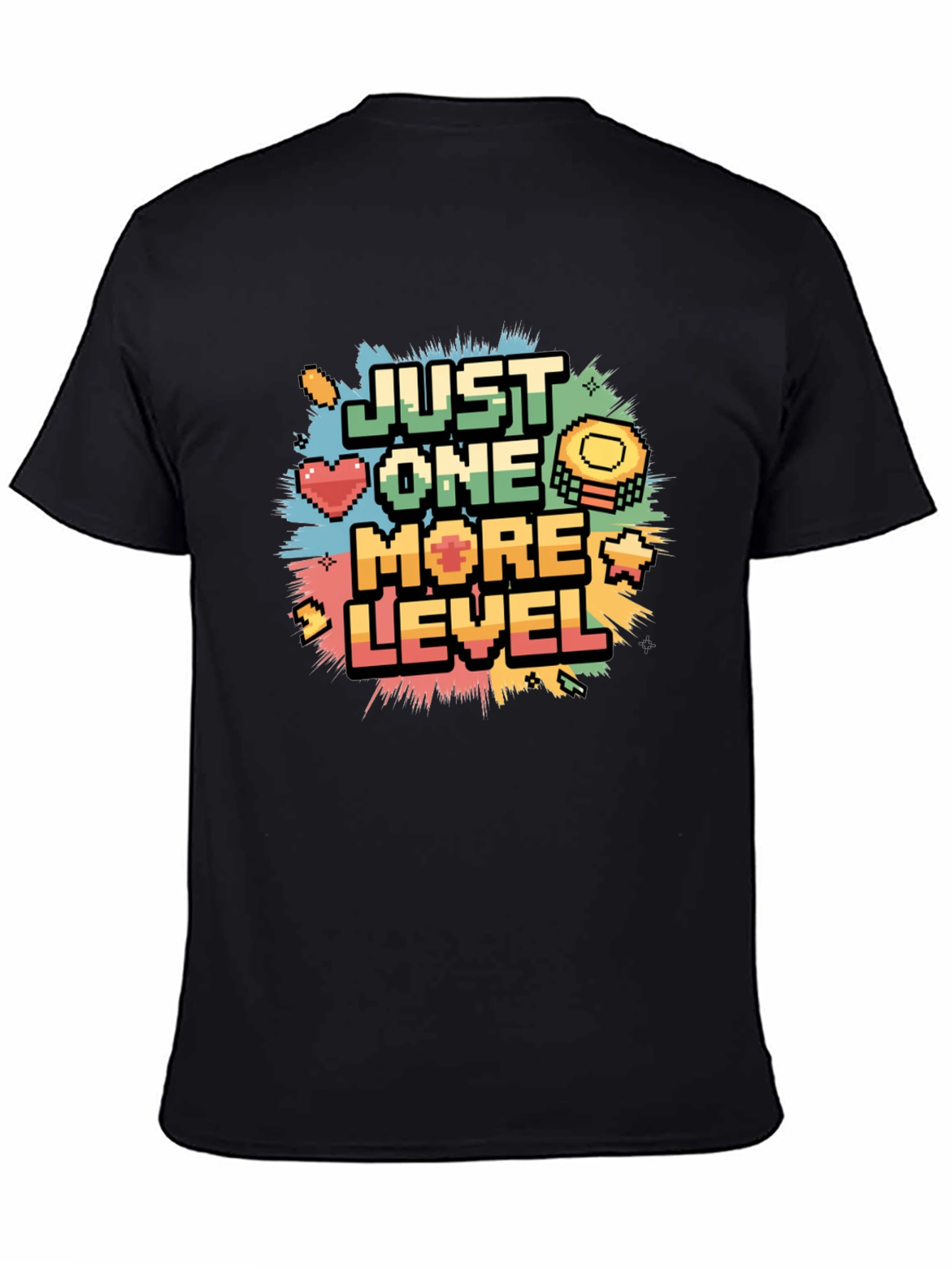 Level up your wardrobe with this awesome black graphic tee! Featuring a vibrant pixelated design with the phrase 'Just One More Level,' this shirt is perfect for gamers and retro enthusiasts alike. The colorful graphic includes pixelated hearts, coins, and stars. Made from a comfortable, breathable fabric, this tee is ideal for casual wear, gaming sessions, or showing off your passion at conventions. Get yours today and let everyone know you're always up for one more challenge!