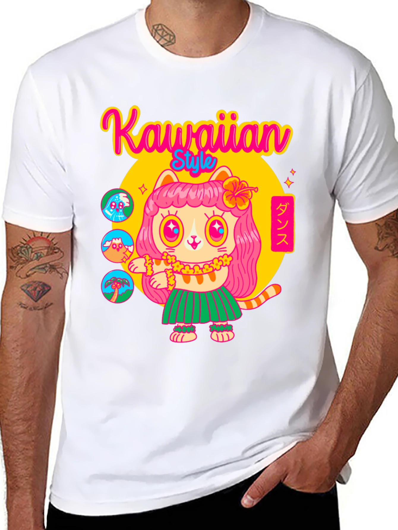 Show off your fun side with this Kawaiian Style T-Shirt! Featuring a cute, cartoon-style cat dressed in a hula skirt and lei, ready to dance. Bright colors and whimsical design makes this a unique addition to your wardrobe. Perfect for casual outings, themed parties, or just lounging at home. Soft, breathable fabric ensures all-day comfort. Embrace the island spirit with this playful and eye-catching tee! This design will make you the life of the party. Get yours today!