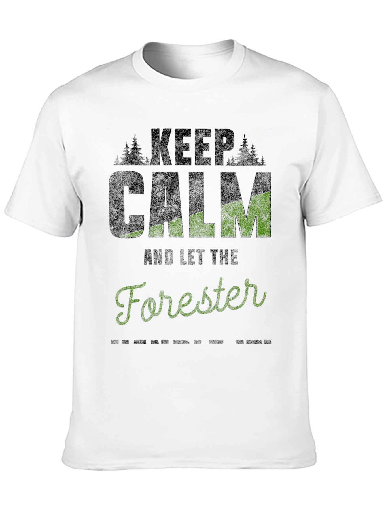 Show off your love for forestry with this unique "Keep Calm and Let the Forester" t-shirt! This classic black tee features a bold, eye-catching design. The words "KEEP CALM" are printed in black lettering, subtly adorned with forest trees, while "Forester" is written in a distinctive green script. The phrase "AND LET THE" adds a nice contrast in a simple, clean font. Crafted from comfortable material, this shirt is perfect for everyday wear, outdoor adventures, or as a thoughtful gift for the forest enthusiast in your life. Let your passion for the great outdoors shine!