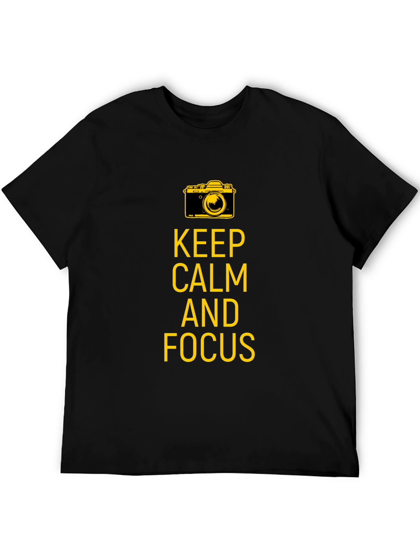 Capture your passion with this stylish black tee! Featuring a crisp camera graphic and the inspiring phrase "Keep Calm and Focus" in bold yellow lettering, this shirt is perfect for photographers and creatives alike. The classic fit and comfortable fabric make it ideal for everyday wear, whether you're out shooting photos or relaxing at home. Show off your love for photography with this eye-catching and motivational tee. A great gift for photography enthusiasts! It's a simple yet thoughtful design to show off your hobby.