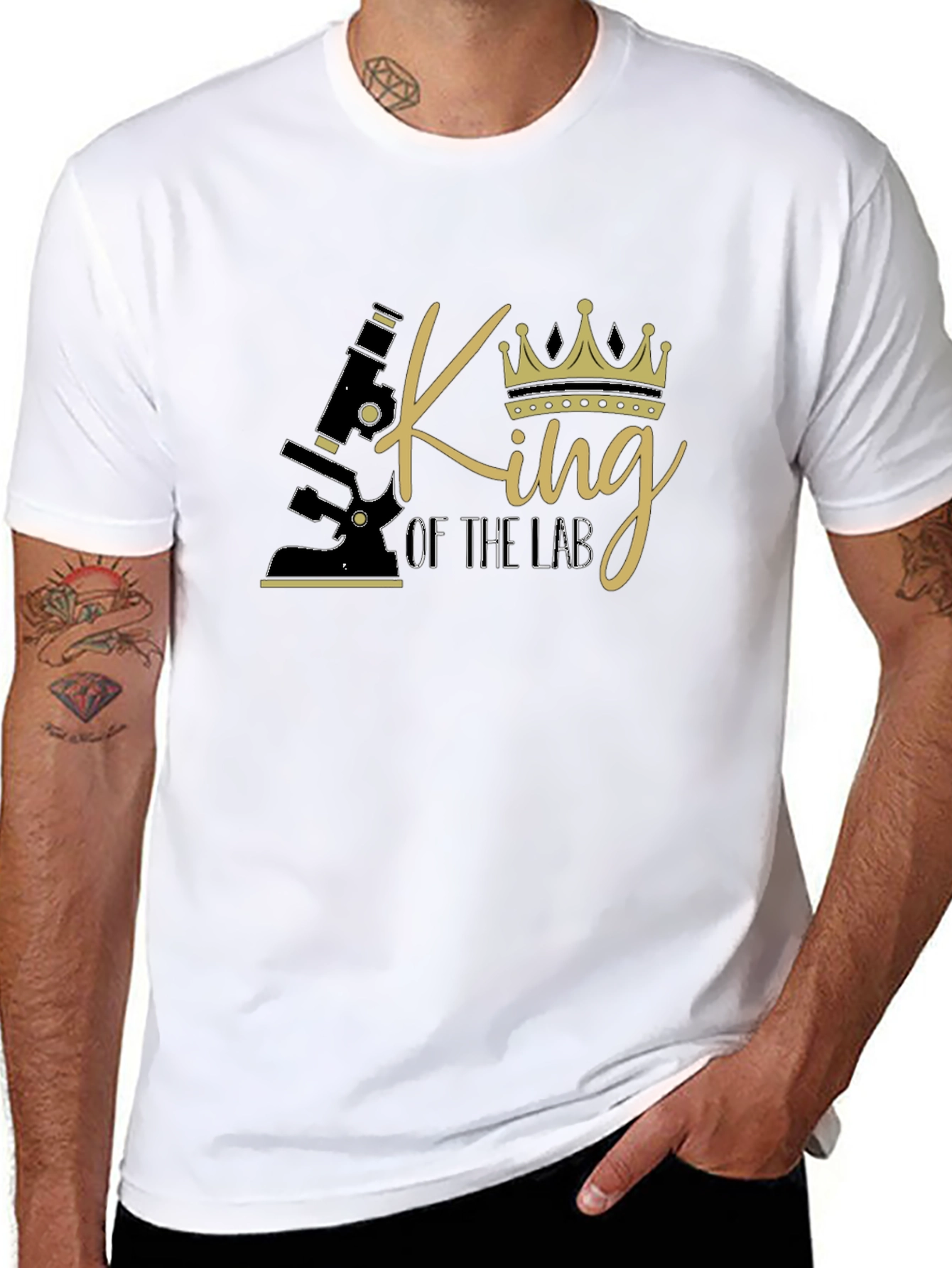 Show your love for science with this unique graphic t-shirt! This stylish black tee features a bold, golden design with a microscope and the words "King of The Lab" topped with a crown. Made from soft, comfortable fabric, this shirt is perfect for everyday wear and ideal for lab workers, scientists, and science enthusiasts alike. Wear it to work, school, or casual outings to express your passion for all things scientific. This t-shirt makes a fun and thoughtful gift for the scientist in your life. A must-have addition to any science lover's wardrobe!