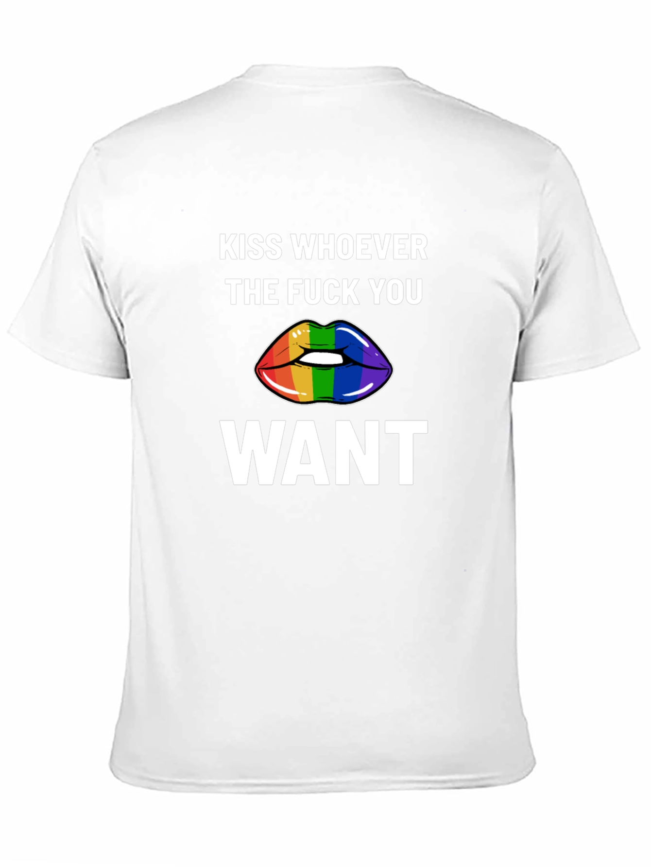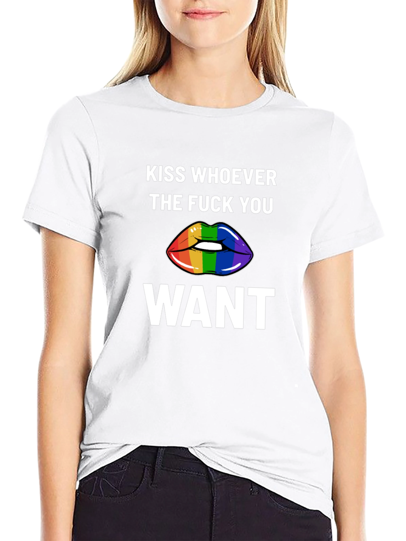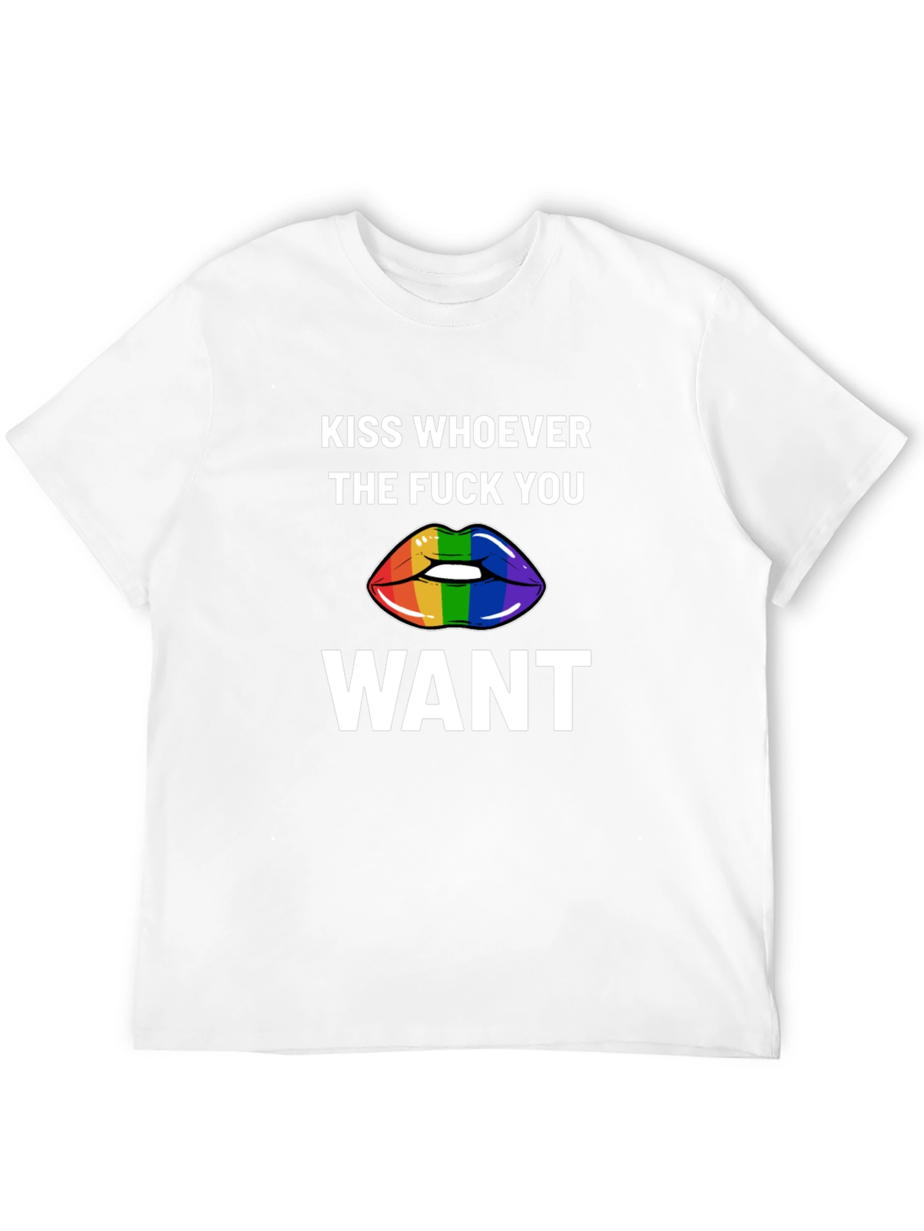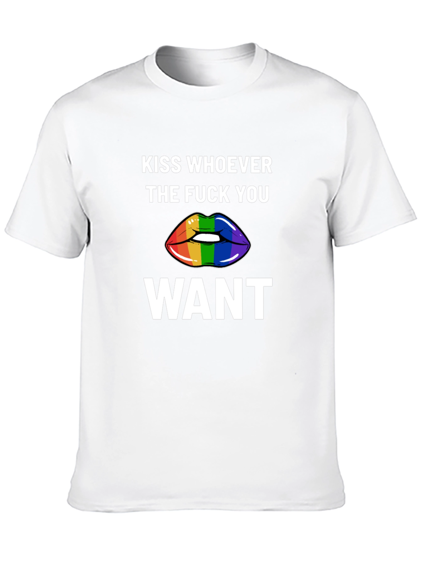 Express yourself with this bold black graphic t-shirt. Featuring the empowering message "KISS WHOEVER THE FUCK YOU WANT" above and below a vibrant rainbow-striped lips graphic. The design is printed in crisp white for maximum contrast and visibility on the black fabric. This tee is perfect for expressing your pride, supporting LGBTQ+ rights, or simply making a statement. Made from comfortable, breathable material, this shirt is ideal for everyday wear, pride events, rallies, or casual outings. Stand out and spread the love with this eye-catching and meaningful t-shirt.