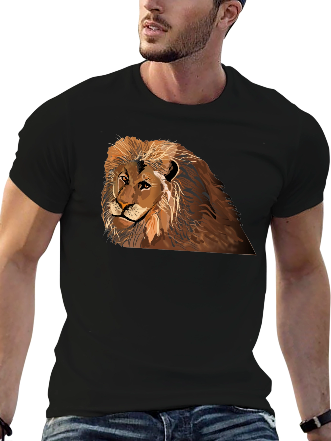 Roar into style with this striking black t-shirt featuring a bold lion graphic. The detailed illustration captures the majestic essence of the king of beasts, making it a standout piece. Crafted from what appears to be a soft and comfortable cotton blend, this crew neck tee offers a relaxed fit for all-day wear. Perfect for casual outings, weekend adventures, or simply expressing your wild side, this t-shirt adds a touch of fierce sophistication to any outfit. The versatile black color ensures it pairs effortlessly with jeans, shorts, or chinos. Let your inner lion shine with this unique and eye-catching graphic tee.