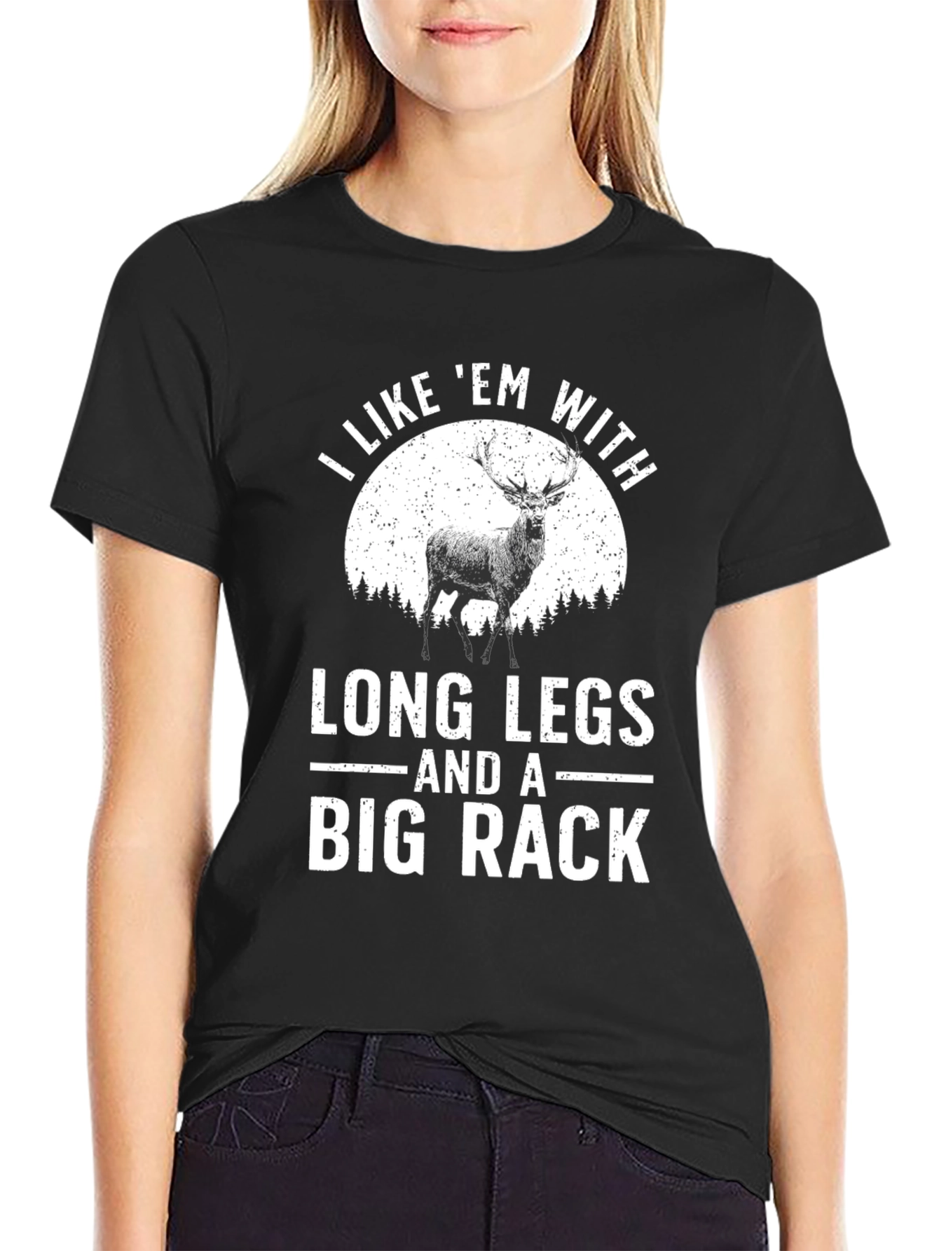 This black t-shirt features a humorous graphic design. The text "I LIKE 'EM WITH LONG LEGS AND A BIG RACK" is prominently displayed in white lettering. Above the text is an illustration of a deer with large antlers, set against a stylized moon and silhouetted trees. The shirt appears to be made of a soft, comfortable fabric. Its classic fit and crew neck make it a versatile addition to any casual wardrobe. Ideal for outdoor enthusiasts, hunters, or anyone with a sense of humor. Wear it while hiking, camping, or simply hanging out with friends.