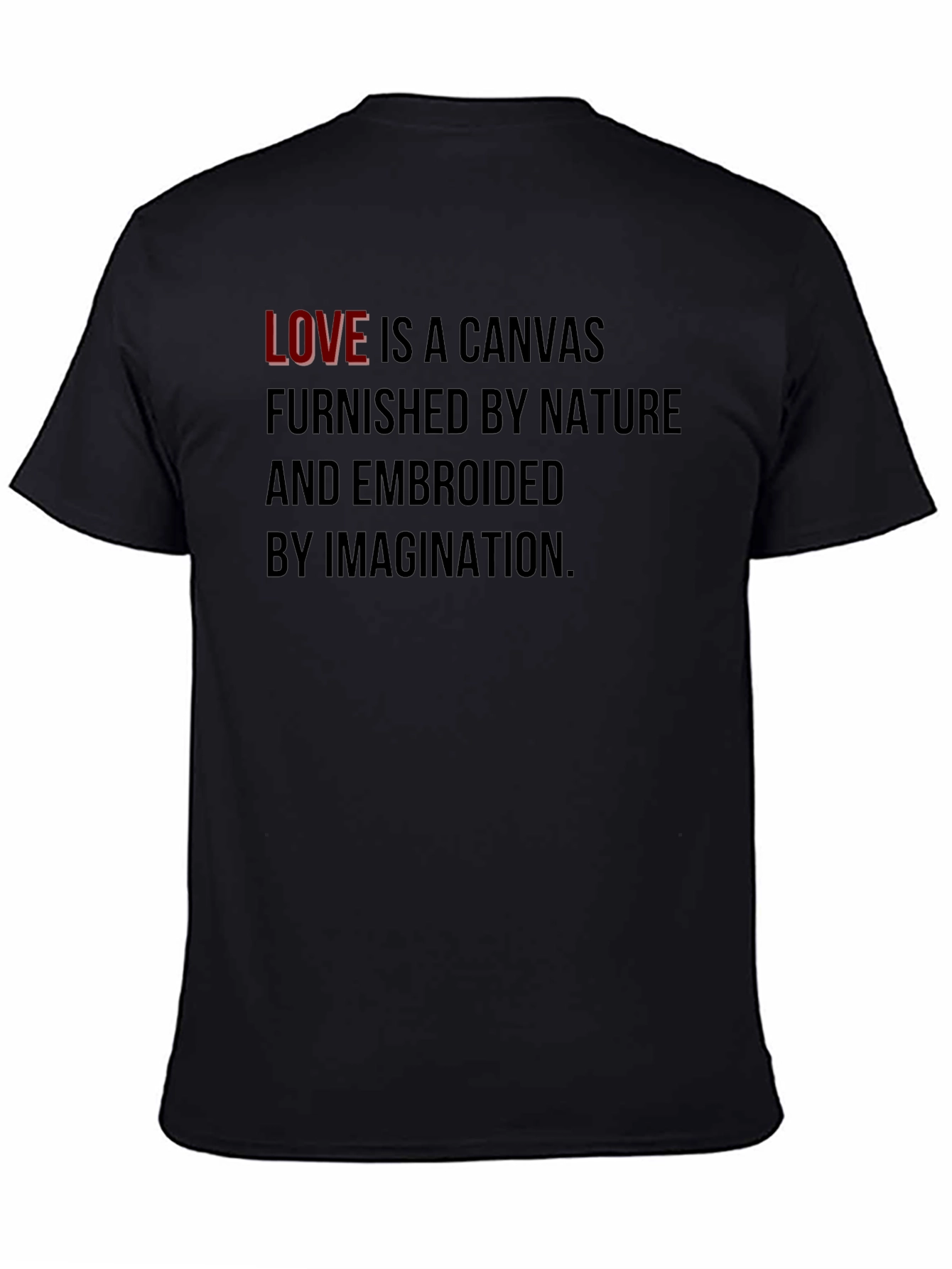 Express yourself with this stylish black t-shirt featuring a unique graphic design. The shirt showcases the word 'LOVE' in red, followed by the phrase 'IS A CANVAS FURNISHED BY NATURE AND EMBROIDED BY IMAGINATION' in a darker font. Made from a comfortable and breathable fabric, this tee is perfect for everyday wear. Its classic fit and sleek design make it a versatile addition to any wardrobe. Ideal for casual outings, social gatherings, or simply relaxing at home, this graphic tee is sure to make a statement. Show off your artistic side and spread a message of love and imagination with this eye-catching t-shirt.