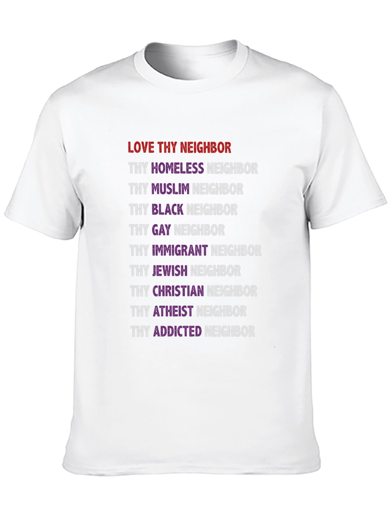 Show your support for equality and inclusion with this powerful "Love Thy Neighbor" t-shirt. The shirt features a bold design with a list of diverse groups, including homeless, muslim, black, gay, immigrant, jewish, christian, atheist and addicted neighbors. Made from comfortable material, this tee is perfect for everyday wear or as a statement piece at rallies, community events, or casual gatherings. Spread a message of love, acceptance, and unity with this eye-catching and meaningful t-shirt.