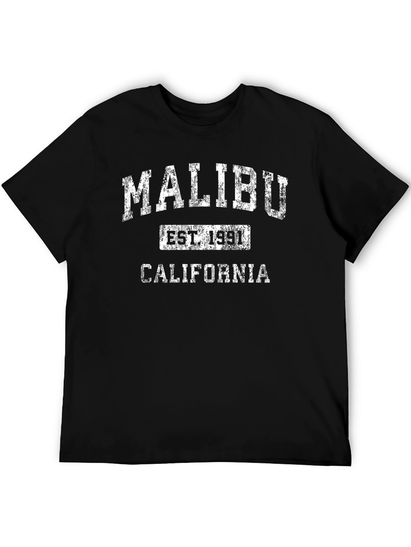 Show off your love for the California coast with this stylish black t-shirt. The shirt features the word "Malibu" in a distressed, vintage-inspired font, with "EST. 1991" and "California" displayed below. The classic black color makes it easy to pair with any outfit, while the comfortable fabric ensures all-day wearability. Whether you're strolling along the beach or hanging out with friends, this t-shirt is the perfect way to express your laid-back California style. Get yours now!
