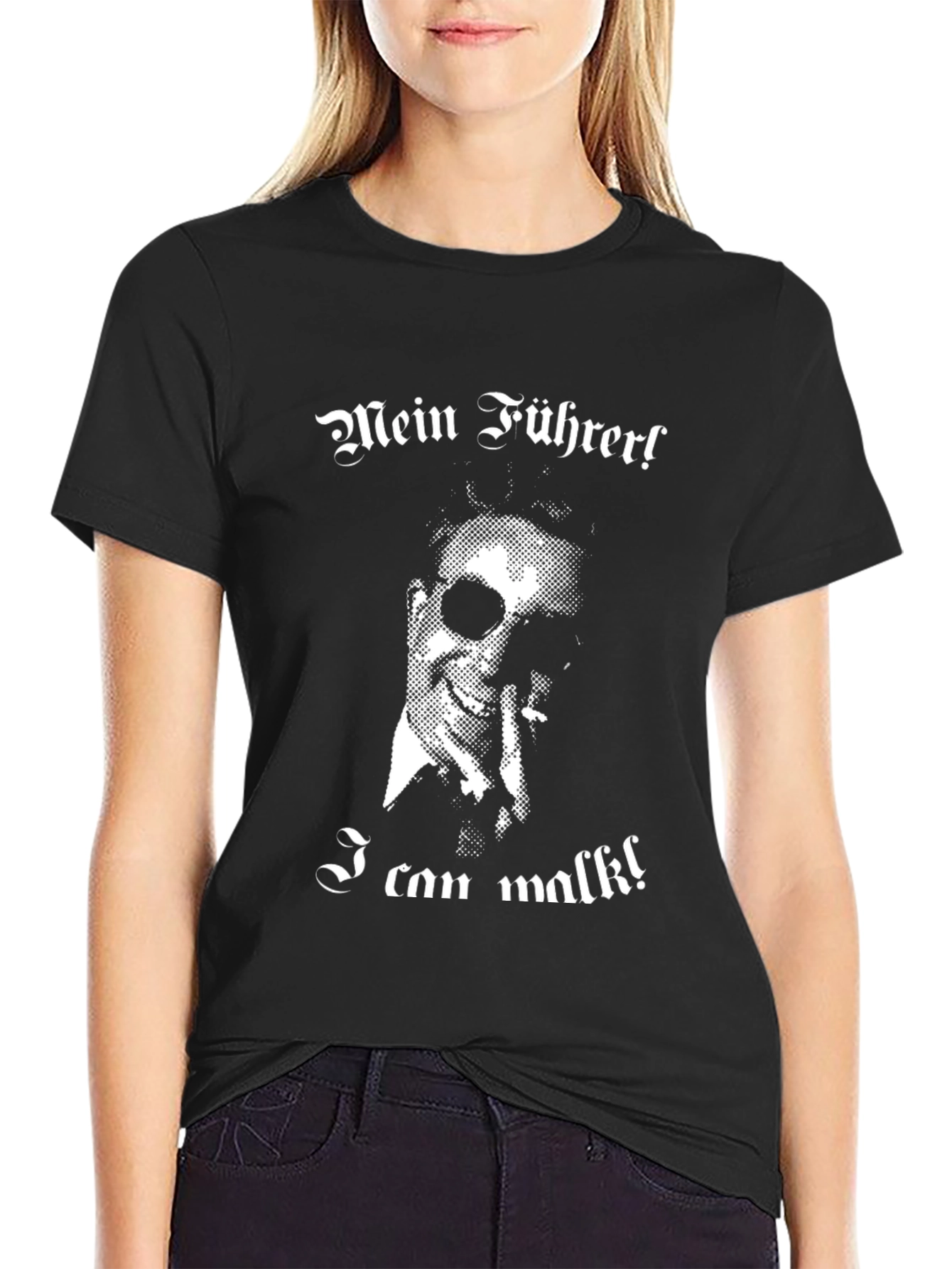 Make a bold statement with this striking graphic tee. The shirt features a black and white image with the text "Mein Fuhrer!" and "I can walk!". The design is unique and eye-catching, perfect for those who like to express their individuality through fashion. Made from comfortable materials, this tee is ideal for casual wear, concerts, or social gatherings where you want to stand out. The shirt's bold design ensures it will be a conversation starter wherever you go.