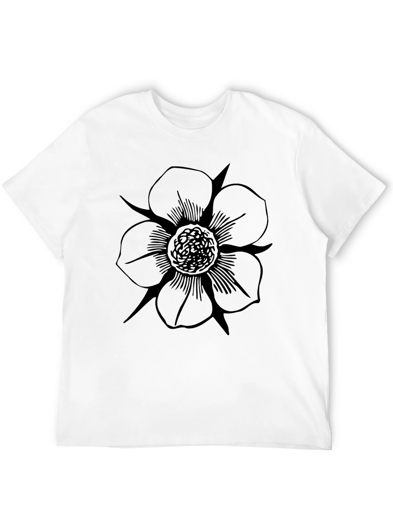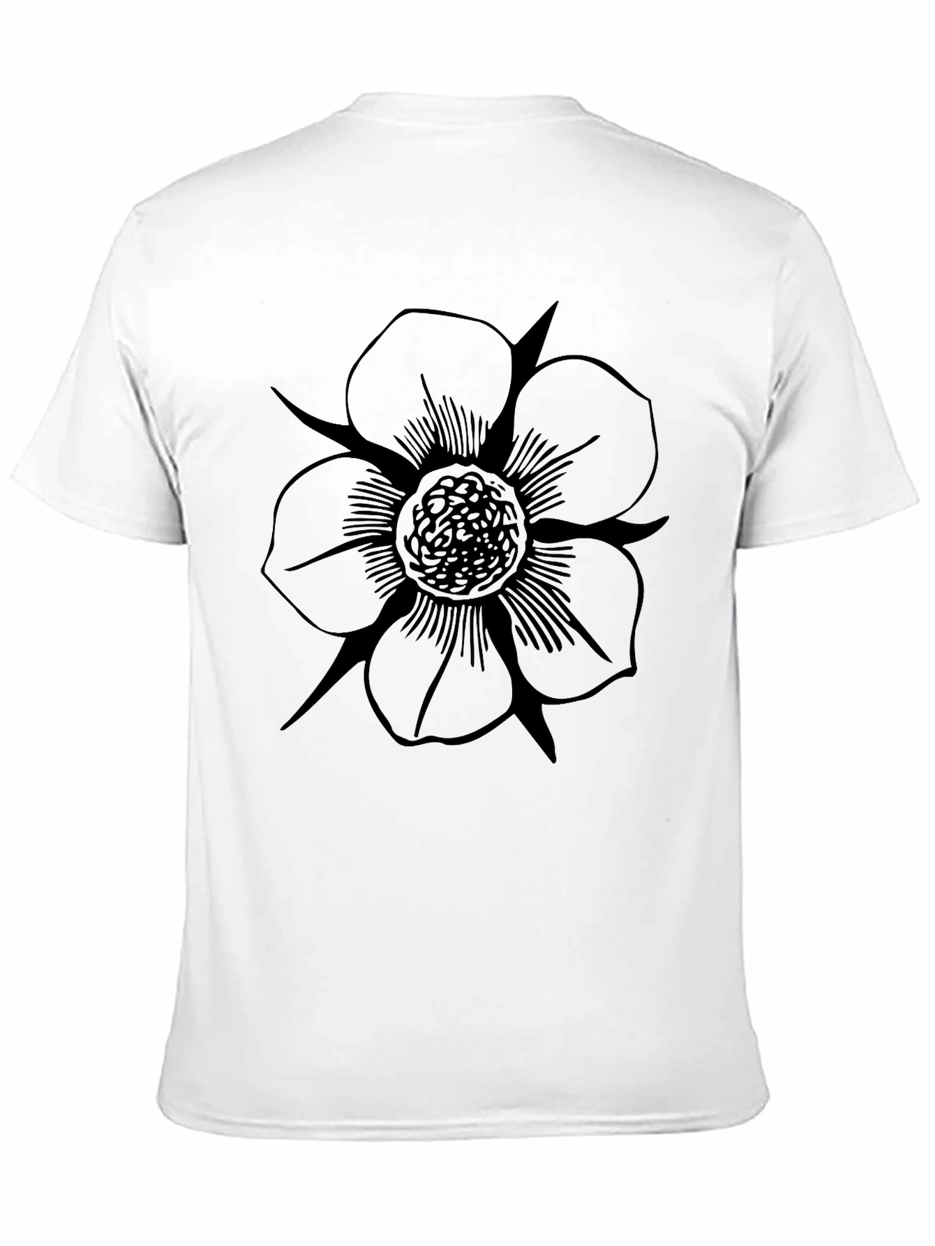This classic men's black t-shirt features a striking floral design. The dark outline of the flower is simple, elegant and makes a statement. Made from a comfortable, breathable fabric, this tee is perfect for everyday wear or casual outings. Pair it with jeans or shorts for a relaxed yet stylish look. The unique floral print adds a touch of individuality to your wardrobe. Comfortable, fashionable, and versatile – this shirt is a must-have for any modern man.