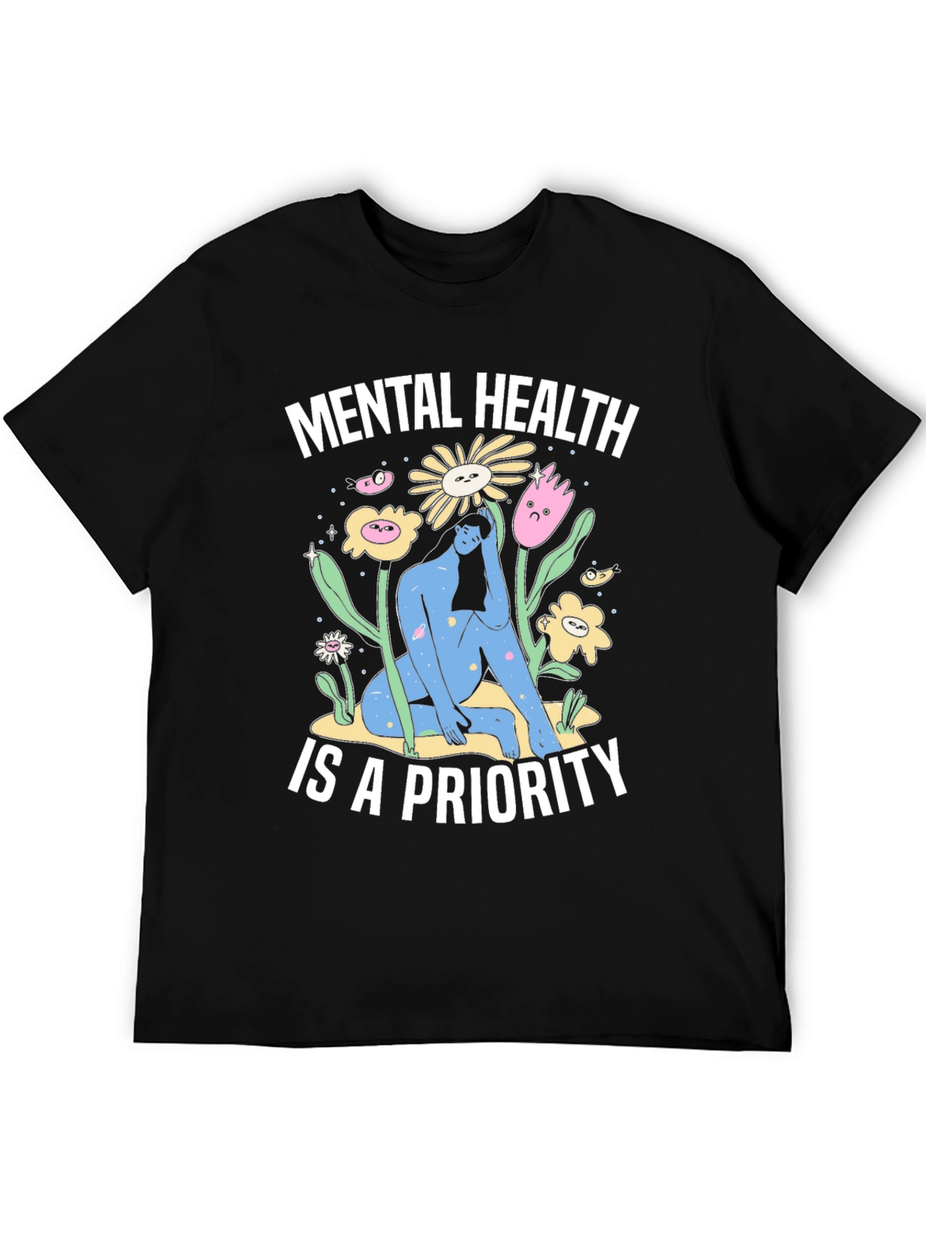 Show your support with this black unisex t-shirt. The tee features a vibrant graphic that includes floral elements and a stylized blue figure, paired with the powerful message "Mental Health Is A Priority." Made from a comfortable fabric, this shirt is ideal for everyday wear, awareness events, or as a meaningful gift. Make a statement while staying comfortable and stylish. A great way to promote mental health awareness!