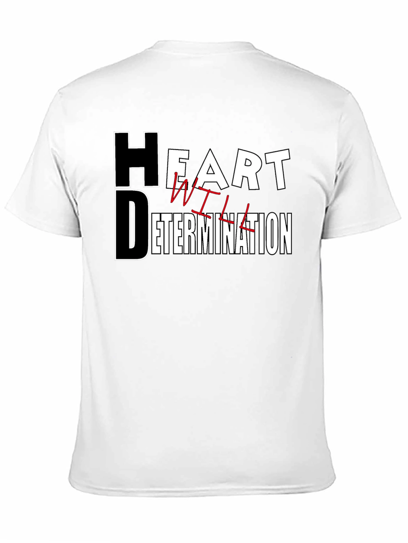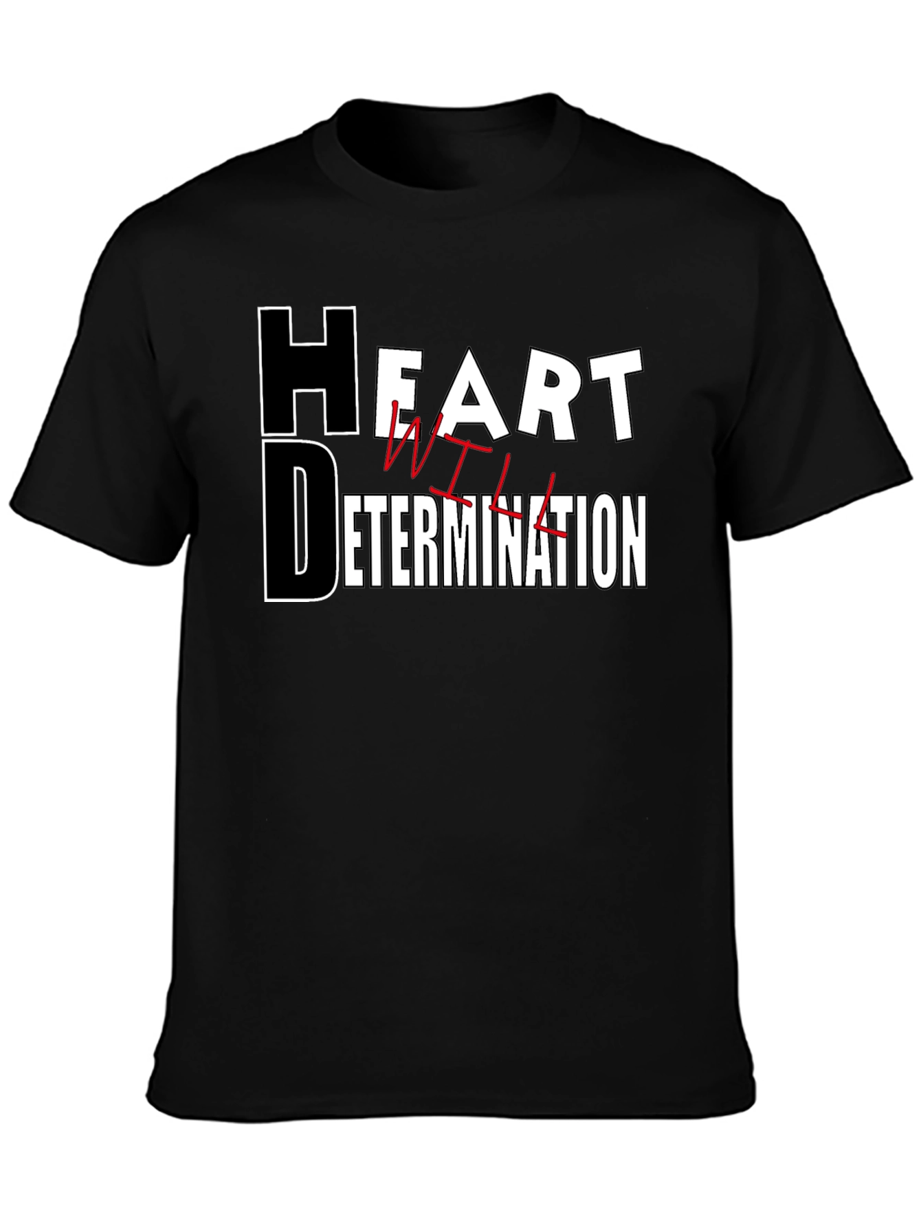 This black t-shirt features a bold, inspirational design with the words 'Heart,' 'Will,' and 'Determination' stacked vertically. The design is a mix of white and red text, with the word 'WILL' crossed out in red, emphasizing the power of heart and determination. Made from a comfortable-looking fabric, this shirt is perfect for workouts, casual wear, or as a motivational statement piece. Show off your inner drive and inspire those around you with this unique tee. Makes a great gift for athletes, entrepreneurs, or anyone pursuing their dreams.