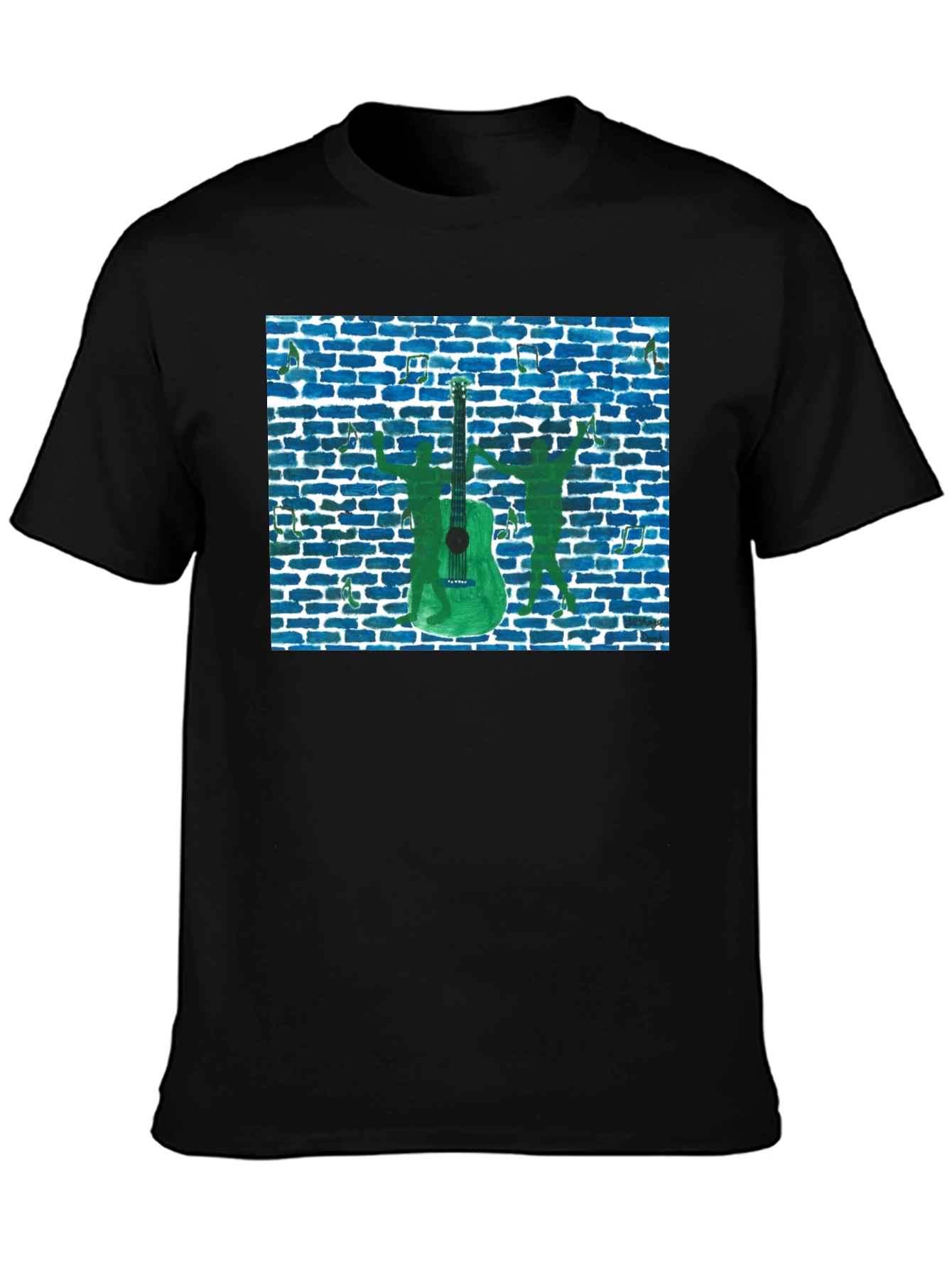 Rock out in style with this unique graphic t-shirt. The design features a vibrant green guitar set against a stylized blue brick wall backdrop adorned with musical notes. The shirt appears to be made from a comfortable, breathable cotton or cotton blend. This eye-catching tee is perfect for music lovers, guitar players, or anyone who wants to express their individuality. Wear it to concerts, casual outings, or simply relaxing at home. It's sure to be a conversation starter!