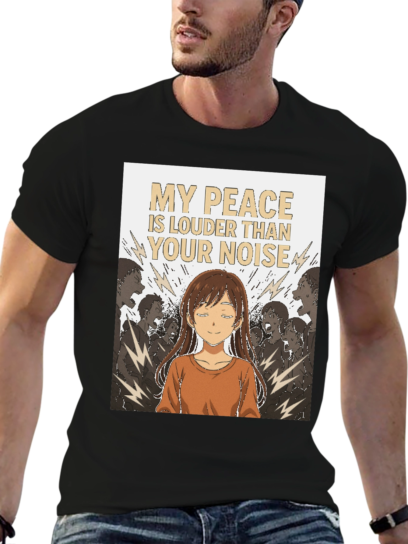Embrace tranquility with this unique t-shirt! The design features a serene anime-style girl amidst a crowd of noisy figures, with the text "My Peace is Louder Than Your Noise." The shirt is made of a soft, comfortable black material, perfect for everyday wear. Show off your peaceful side with this stylish and thought-provoking t-shirt. Ideal for casual outings, lounging at home, or making a statement about the importance of inner peace. Get yours today and let your peace shine through!