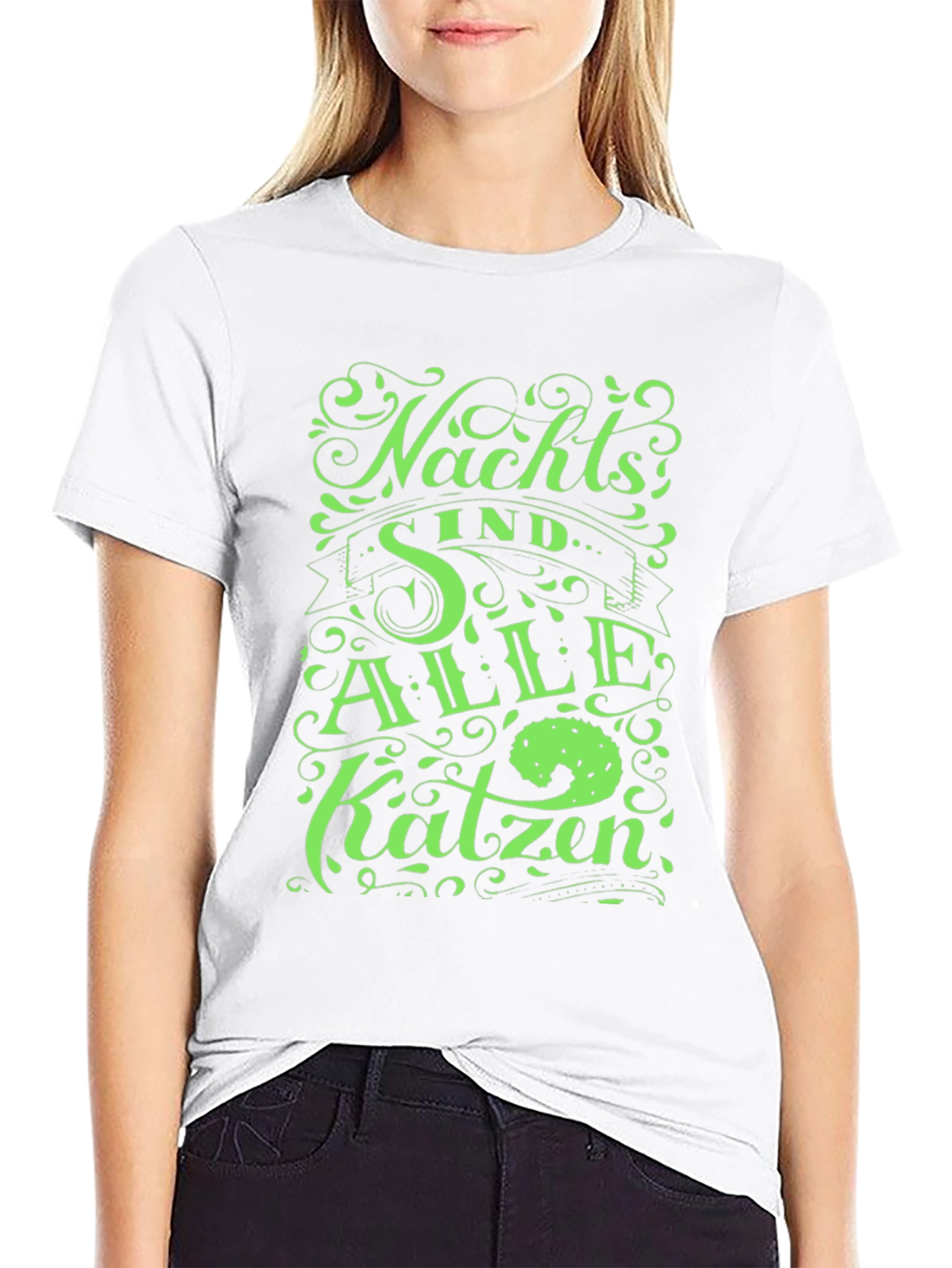 Show off your unique style with this eye-catching black t-shirt! The shirt features a vibrant green graphic that reads 'Nachts Sind Alle Katzen' in an ornate, vintage-inspired design. Made from a comfortable-looking fabric, this tee is perfect for everyday wear. The quirky design and bold lettering make it a standout piece for casual outings, parties, or simply lounging at home. Whether you're a cat lover or just appreciate creative typography, this t-shirt is sure to become a favorite in your wardrobe. Get yours today and make a statement!