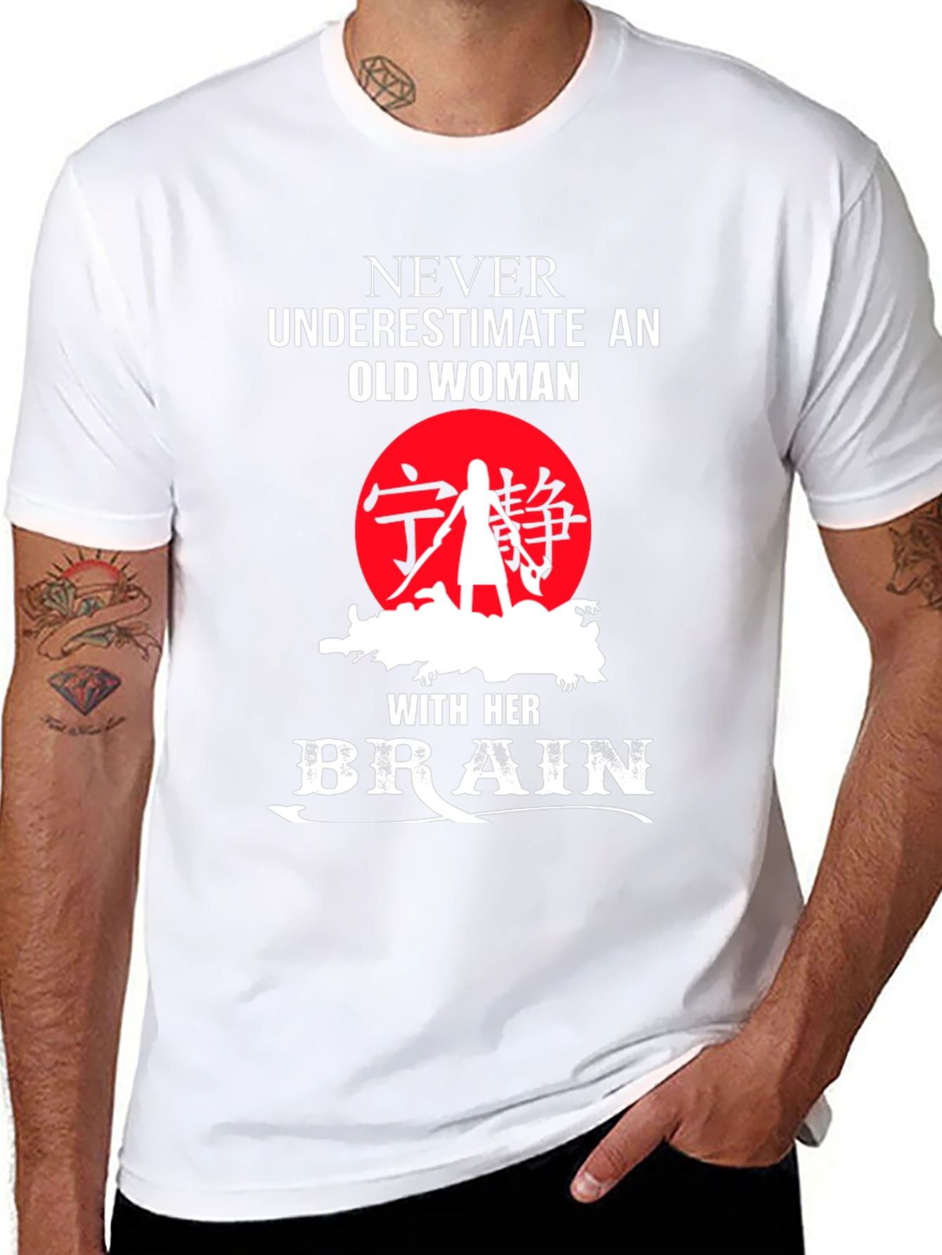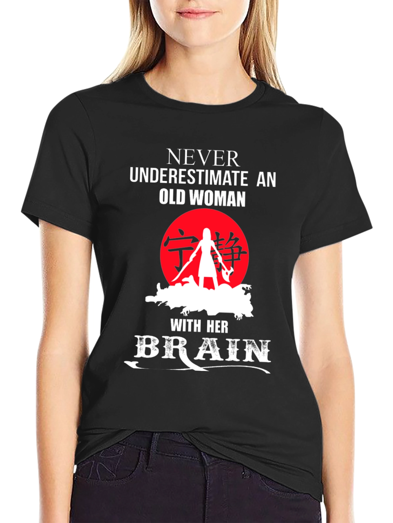 Show off your unique style with this bold black t-shirt. The design features the phrase "Never Underestimate An Old Woman With Her Brain" above a graphic of a silhouetted woman amidst zombie figures, set against a bold red sun. This shirt is made from comfortable, breathable fabric, perfect for everyday wear. Its eye-catching design is sure to spark conversation and add a touch of humor to your wardrobe. Wear it casually with jeans or dress it up with a jacket for a night out. Makes a great gift for the smart and sassy women in your life!