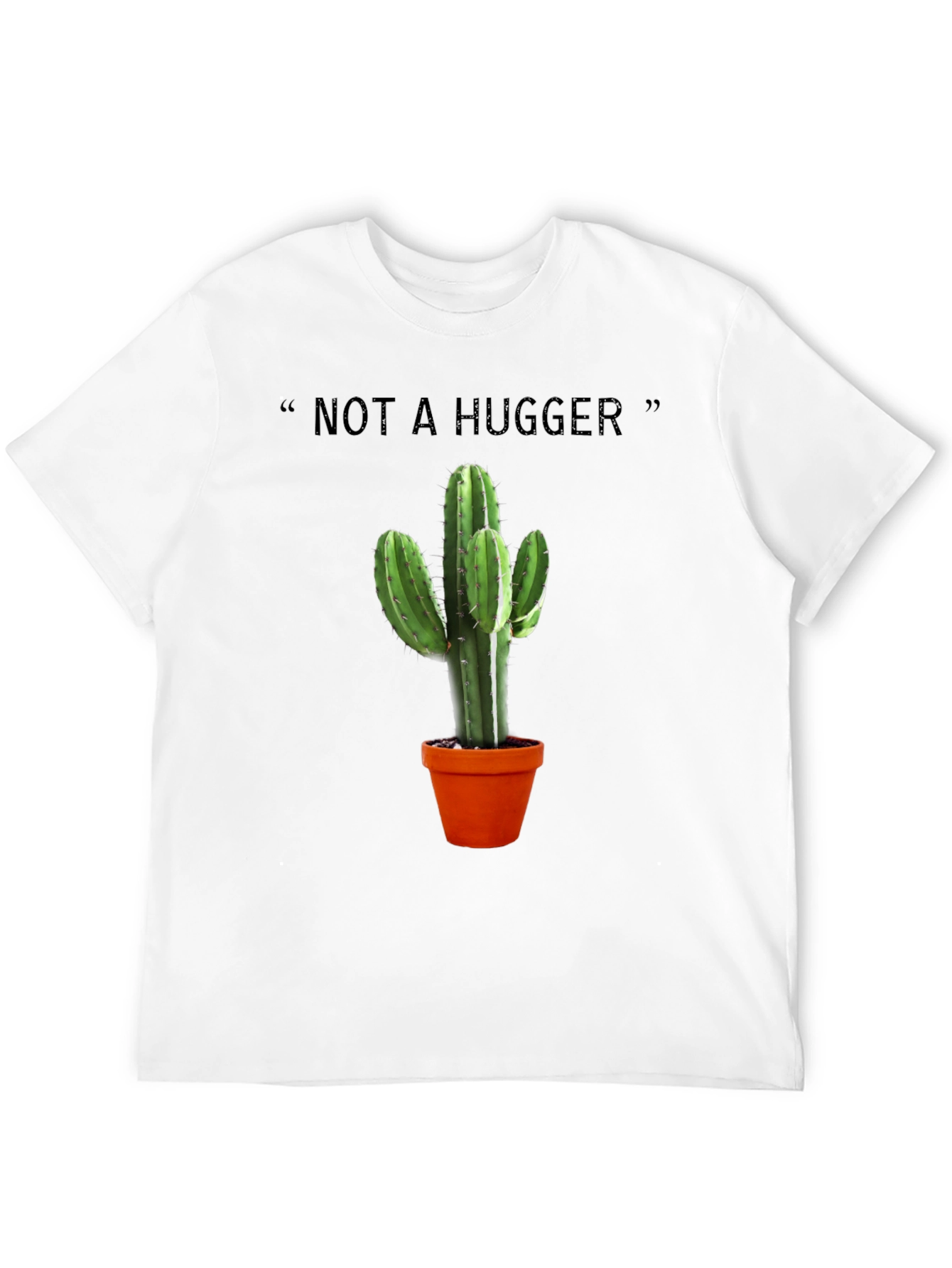 This stylish black t-shirt features a bold statement with a humorous twist. The phrase "Not a Hugger" is printed above a realistic image of a potted cactus, creating a fun and quirky design. Made from a comfortable, soft fabric, this tee is perfect for casual wear and expressing your unique personality. The vibrant colors of the cactus pop against the black background, making it a standout piece. Wear it to social gatherings, casual outings, or simply as a statement of personal space. A must-have for anyone with a sense of humor and a love for cacti!
