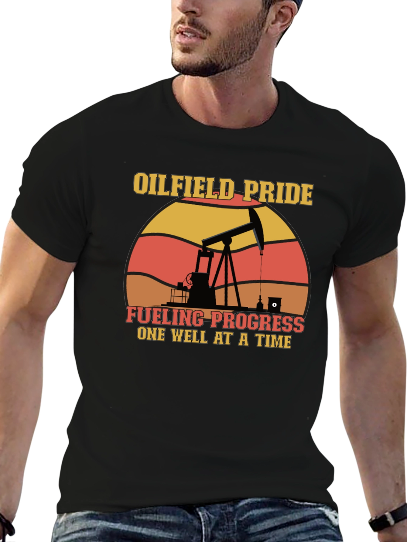 Show your oilfield pride with this vintage-inspired graphic tee. The black t-shirt features a striking design with "OILFIELD PRIDE" at the top and "FUELING PROGRESS ONE WELL AT A TIME" at the bottom, sandwiching an oil rig silhouette against a retro sunset backdrop. The tee’s short sleeves and classic cut make it perfect for everyday wear. This comfortable tee is ideal for oilfield workers, enthusiasts, or anyone who wants to showcase their appreciation for the industry. Wear it to work, casual outings, or industry events to make a bold statement!