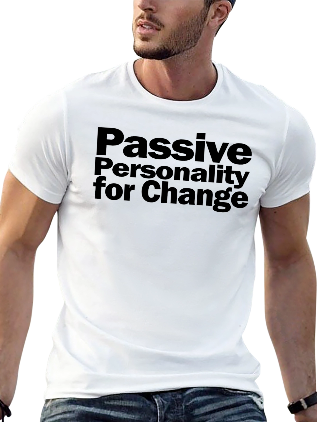 Showcase your subtle approach with this "Passive Personality for Change" graphic tee. Crafted from what appears to be soft cotton, this classic black t-shirt features a bold, eye-catching message emblazoned across the chest. The design promotes a unique blend of introspection and motivation, making it perfect for casual outings, laid-back weekends, or as a conversation starter. Whether you're advocating for personal growth or simply embracing a thoughtful style, this statement tee is the ideal choice. Pair it with jeans or shorts for an effortless, trendy look. Available in various sizes.