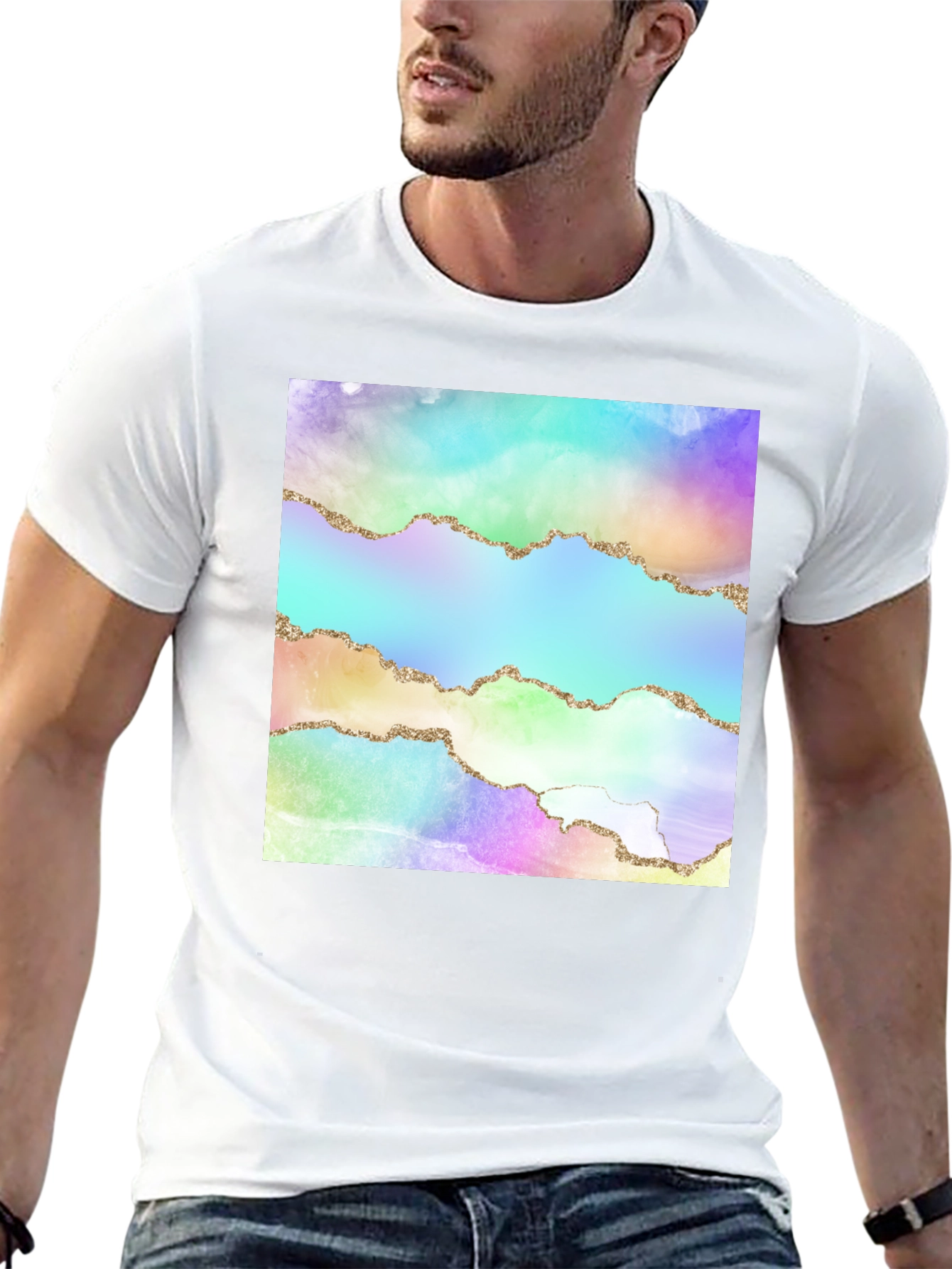 This stylish black t-shirt features a mesmerizing pastel marble design. The abstract pattern blends soft hues of blue, pink, green, and gold, creating a visually stunning effect. The gold adds a touch of luxury and sophistication. Made from comfortable cotton, this tee is perfect for casual wear or dressing up for a trendy look. Show off your unique style with this eye-catching t-shirt! Ideal for adding a pop of color and artistry to any outfit.