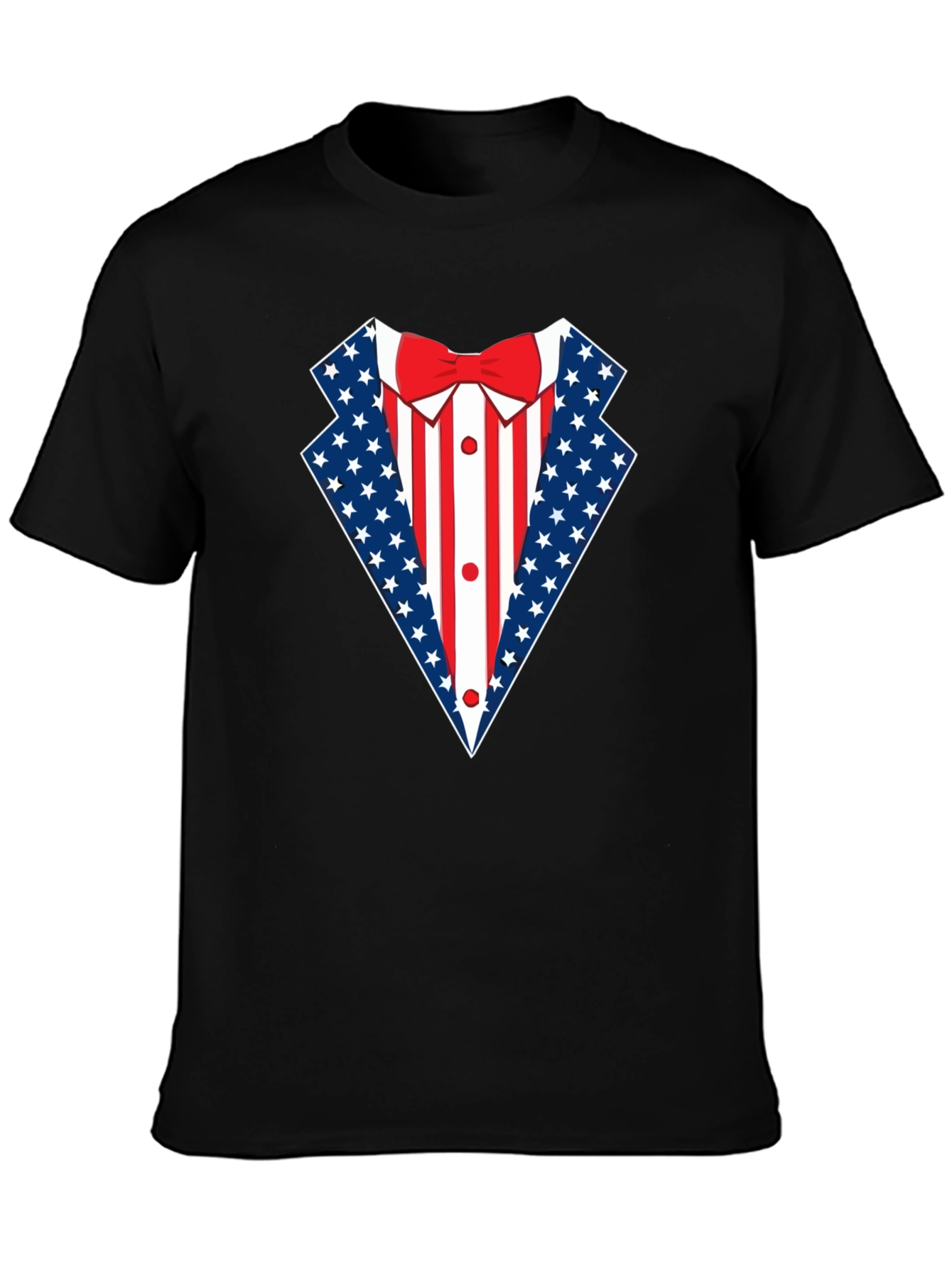 Show your American pride with this unique t-shirt. The design features a tuxedo print in the style of the American flag. The lapels are decorated with stars, while the shirt front is red and white stripes. The look is completed with a red bowtie. It is a perfect addition to your Fourth of July wardrobe or for everyday wear. This shirt is sure to turn heads and spark conversations wherever you go. It's a fun and festive way to celebrate the land of the free!