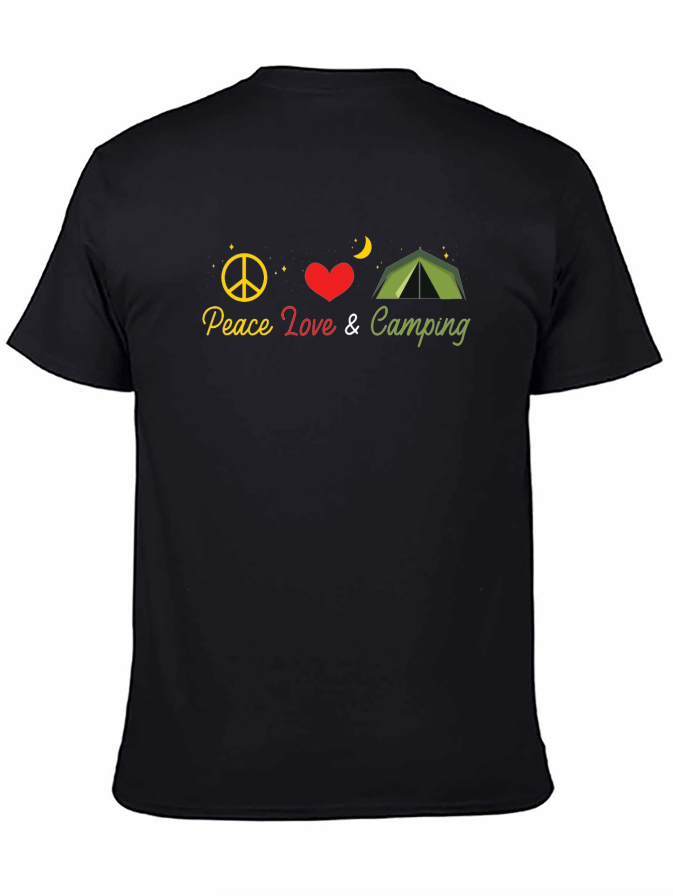 Embrace the great outdoors with this stylish black t-shirt featuring a vibrant graphic print. The design showcases a peace symbol, a heart, and a camping tent with a crescent moon, accompanied by the words "Peace Love & Camping." Made from a comfortable, breathable fabric, this tee is perfect for casual wear, camping trips, or expressing your love for nature. Its classic fit and versatile design make it an ideal addition to any wardrobe. Show off your adventurous side with this unique and eye-catching t-shirt. Perfect for outdoor enthusiasts!