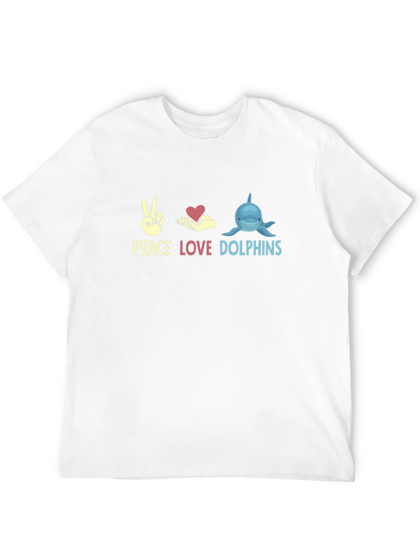 Show your love for marine life with this stylish black t-shirt. Featuring a playful graphic that combines peace, love, and dolphins, this tee is perfect for casual wear. The design incorporates a peace sign, a heart held in open hands, and a charming cartoon dolphin, all rendered in vibrant colors. Made from a soft, comfortable fabric, this shirt is ideal for everyday wear, whether you're heading to the beach, hanging out with friends, or simply expressing your passion for dolphins. Grab yours now and spread the love!