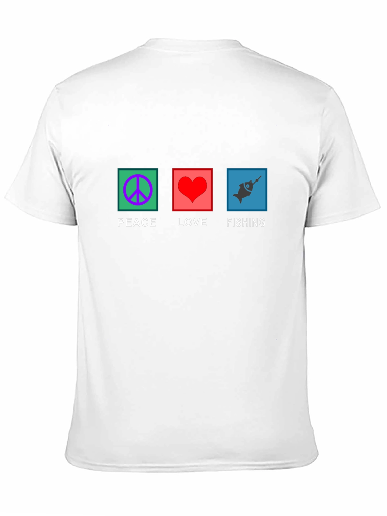 Show your passion for peace, love, and fishing with this unique graphic tee. The shirt features three distinct square graphics: a purple peace symbol, a red heart, and a blue fish design, each accompanied by its respective word. Made from comfortable, breathable fabric, this t-shirt is ideal for casual wear, fishing trips, or expressing your hobbies. Stand out with this eye-catching design. Makes a great gift for anglers and nature lovers. Perfect for everyday wear, outdoor adventures, or casual gatherings. Get yours today and spread positive vibes wherever you go!