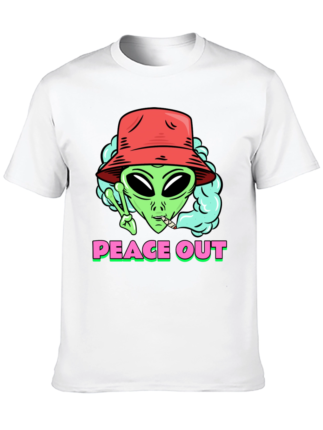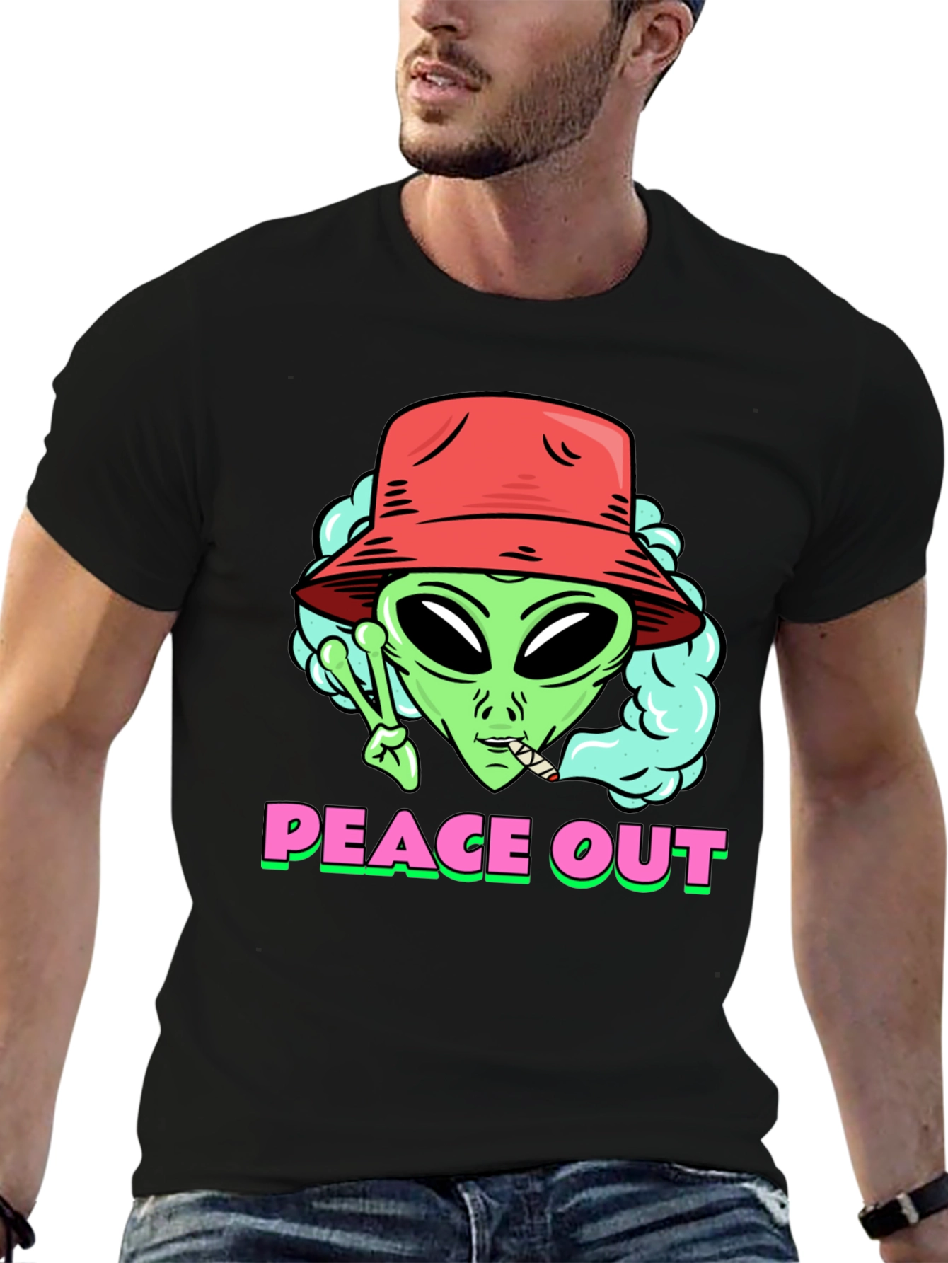 Rock this cool, comfortable black t-shirt featuring a unique alien graphic. The design showcases a green alien wearing a red bucket hat and flashing a peace sign, while enjoying a smoke. Below the design, find the bold text "PEACE OUT" in eye-catching pink and green colors. This tee is perfect for casual wear, parties, or expressing your individual style. Made from soft, breathable fabric, this t-shirt offers all-day comfort and a relaxed fit. Show off your love for extraterrestrial coolness with this must-have shirt!