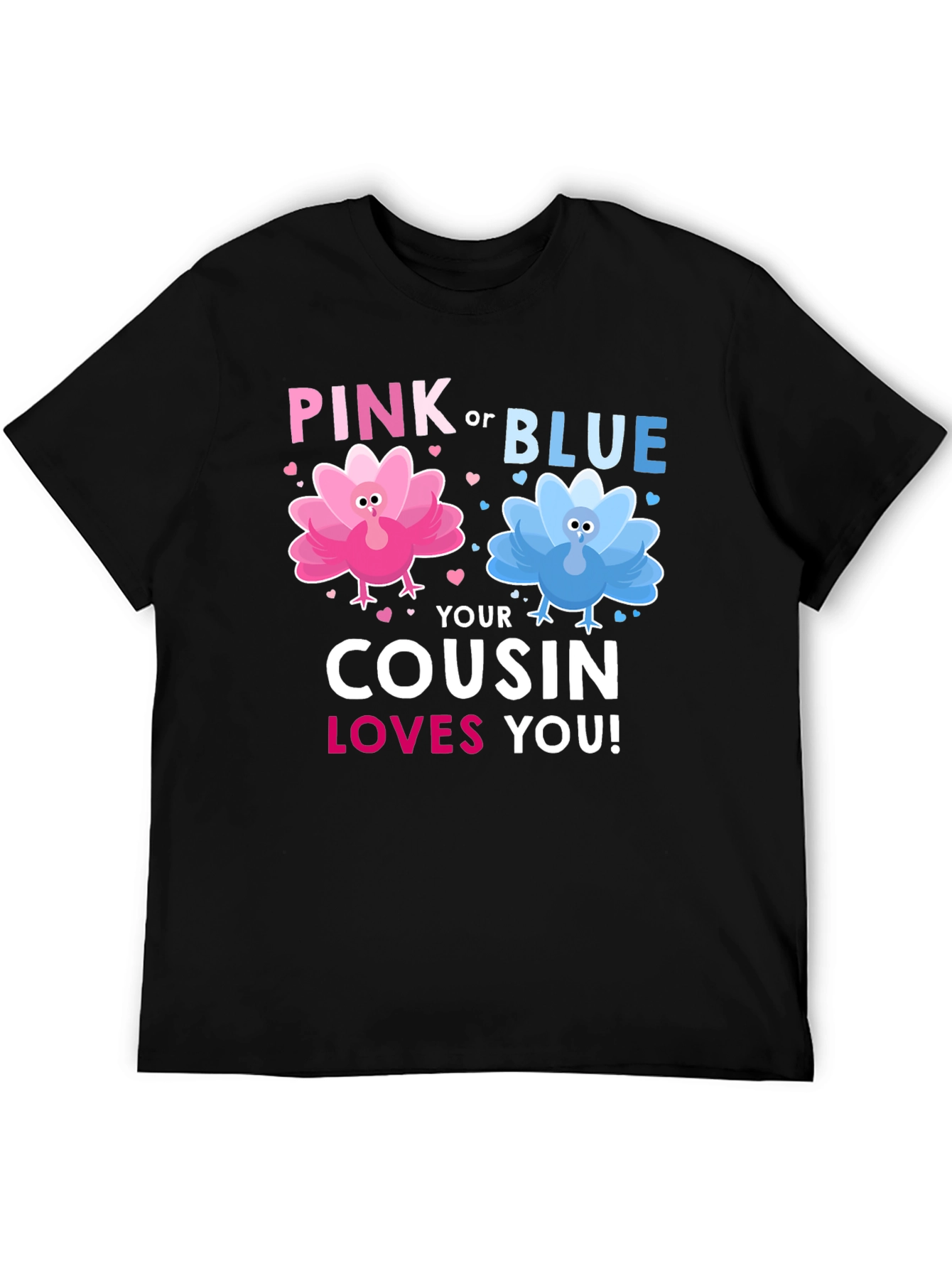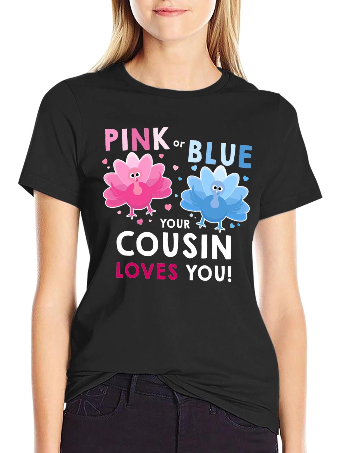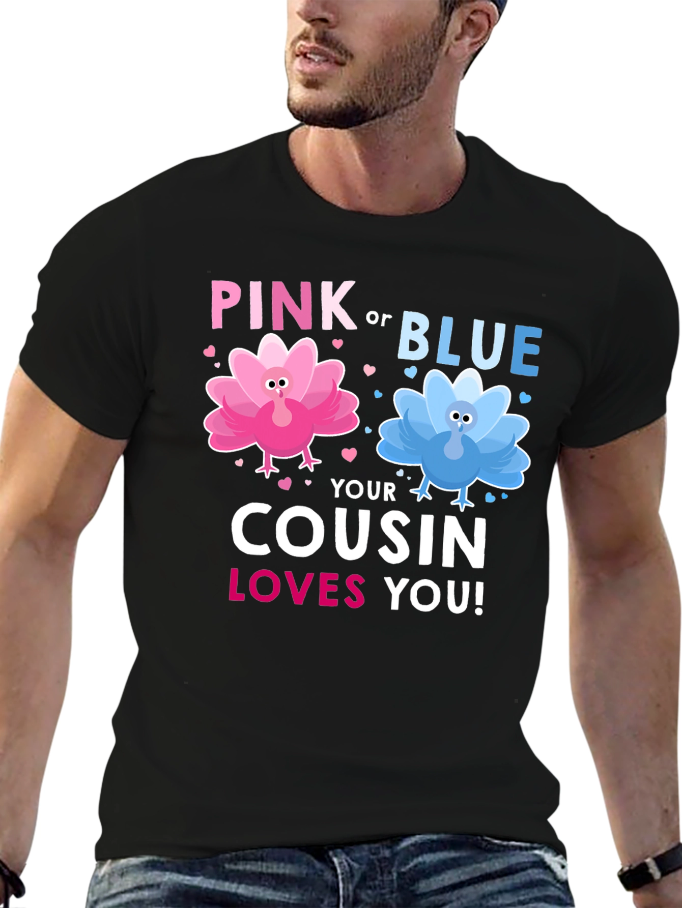 Celebrate a special baby gender reveal with this adorable "Pink or Blue Your Cousin Loves You!" t-shirt. Featuring two charming cartoon turkeys, one in pink and the other in blue, this tee is perfect for the cousin ready to welcome a new family member. The cute heart details add a touch of sweetness to the design. Made from a comfortable, breathable fabric (as visible from the picture), this shirt is ideal for wearing to a gender reveal party or for everyday fun. The vibrant colors and playful design are sure to make a statement. Show your love and excitement for the new baby with this heartwarming t-shirt!